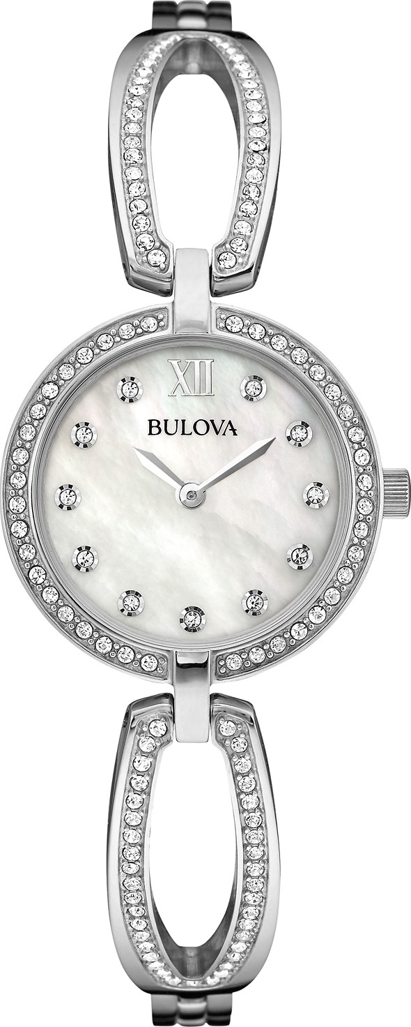Rất nhiều điểm nhấn pha lê trang trí gần như mọi chi tiết của chiếc đồng hồ đeo tay tuyệt đẹp này của Bulova.