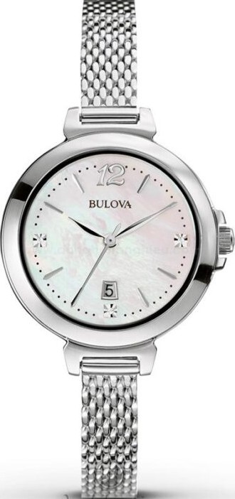 Vỏ đồng hồ bằng thép không gỉ với dây đeo dạng lưới bằng thép không gỉ. Vòng bezel cố định bằng thép không gỉ. Mặt số khảm xà cừ trắng với kim và vạch chỉ giờ màu bạc. Chữ số Ả Rập ở vị trí 12 giờ. Các viên pha lê đánh dấu vị trí 3, 6 và 9 giờ. Vạch chỉ phút xung quanh viền ngoài. Loại mặt số: Analog. Hiển thị ngày ở vị trí 6 giờ. Bộ máy thạch anh. Mặt kính khoáng chống trầy xước. Núm vặn kéo/đẩy. Nắp lưng kín. Kích thước vỏ: 30 mm. Độ dày vỏ: 9 mm. Hình dạng vỏ tròn. Chiều rộng dây đeo: 8 mm. Khóa cài trang sức. Chống nước ở độ sâu 30 mét / 100 feet.