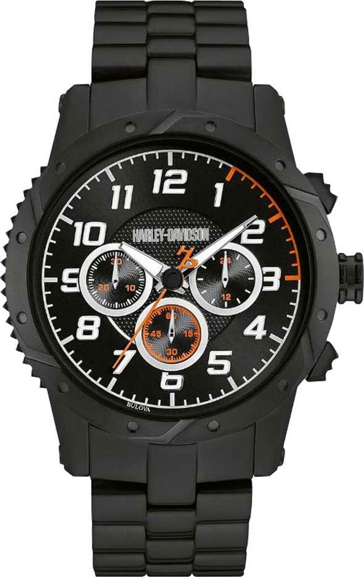 Đồng hồ Bulova dành cho nam giới của Harley-Davidson®. Từ Bộ sưu tập Đĩa phanh. Đồng hồ bấm giờ sáu kim với thiết kế bezel lấy cảm hứng từ đĩa phanh xe máy, mặt số màu đen nhiều lớp có hoa văn với vạch phút đóng màu trắng và màu cam. Kim giây màu cam với bộ đếm HD đặc trưng. Vỏ và vòng đeo tay bằng thép không gỉ mạ ion màu đen có khóa gập và khóa an toàn. Chống nước lên tới 50m/165ft.