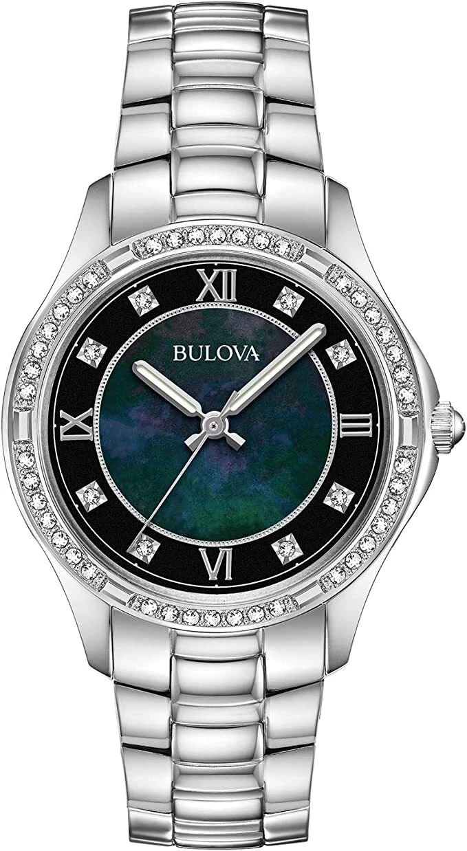 Thuộc bộ sưu tập Crystal. Đồng hồ thép không gỉ mặt đen, thiết kế mỏng, tinh tế với 50 viên pha lê trên vành bezel, mặt kính khoáng phẳng, dây đeo thép không gỉ với khóa gập ngắn. Đường kính: 32mm. Độ dày vỏ 7 mm. Chiều rộng dây đeo 14 mm. Màu dây đeo Bạc. Màu mặt số Xà cừ. Chất liệu viền Thép không gỉ. Chức năng viền Cố định. Chống nước 30M . Trọng lượng sản phẩm 79 g. Bộ máy Quartz