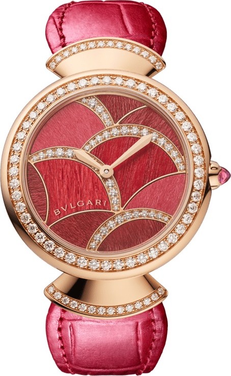 Sự kết hợp tinh tế giữa sự sáng tạo vui tươi và kỹ thuật chế tác trang sức bậc thầy, đồng hồ Divas' Dream bằng vàng hồng 18k thể hiện sự tinh thông của Bvlgari với những màu sắc quyến rũ, chất liệu độc đáo và nghề thủ công truyền thống. Trên mặt số, họa tiết hình quạt mang tính biểu tượng, bắt nguồn sâu xa từ di sản văn hóa của Rome, được khảm thủ công với các chi tiết gỗ đỏ và kim cương pavé trong một bố cục khảm tinh xảo. Một chiếc vòng tay bằng da cá sấu đỏ ton sur ton hoàn thiện vẻ đẹp của mẫu đồng hồ này. Đồng hồ Divas' Dream với bộ máy thạch anh, chức năng hiển thị giờ và phút, vỏ và vành bezel 33 mm bằng vàng hồng 18k được đính 48 viên kim cương cắt brilliant, núm vặn bằng vàng hồng 18k được đính đá rubellite cắt cabochon, các mắt xích bằng vàng hồng 18k được đính 28 viên kim cương cắt brilliant, mặt số khảm với các chi tiết gỗ hình cánh hoa đỏ và kim cương cắt brilliant, vòng tay bằng da cá sấu đỏ và khóa cài bằng vàng hồng 18k. Chống nước đến 30 mét. Đường kính (mm): 33. Hình dạng vỏ: Tròn. Chức năng: Giờ-Phút. Loại máy: Thạch anh. Chất liệu dây đeo: Da cá sấu. Khả năng chống nước: 30 m. Số lượng chân kính: 1. Khóa: Khóa ghim. Chất liệu: Vàng hồng. Đá quý: Kim cương. Màu sắc: Đỏ. Sản xuất tại: Thụy Sĩ. Màu dây đeo: Đỏ
