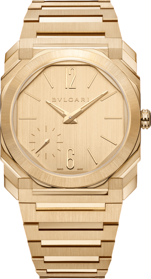Là một biểu tượng đích thực của thế kỷ 21, đồng hồ Octo Finissimo Automatic thể hiện sự kết hợp hiếm có giữa thiết kế táo bạo của Ý và kỹ thuật chế tạo của Thụy Sĩ. Với đường kính 37 mm tinh tế và bộ máy tự động siêu nhỏ, siêu mỏng với khả năng dự trữ năng lượng 72 giờ, chiếc đồng hồ bằng vàng vàng 18k được đánh bóng mờ này toát lên vẻ thanh lịch hiện đại đồng thời thể hiện cơ chế hoạt động tiên tiến. Là minh chứng cho mối liên kết không thể thiếu của Bvlgari giữa kỹ thuật chế tác trang sức và nghệ thuật chế tác đồng hồ, nó phản ánh cách tiếp cận đặc trưng của thương hiệu trong việc sử dụng các vật liệu quý, cũng như khả năng tạo ra các xu hướng thiết kế mới trong thế giới đồng hồ Thụy Sĩ. Đồng hồ Octo Finissimo Automatic với bộ máy cơ siêu mỏng (2,35 mm) do hãng tự sản xuất, lên dây tự động, rô-tơ siêu nhỏ bằng bạch kim, chức năng hiển thị giờ, phút và giây nhỏ, bộ máy BVF 100—Finissimo được trang trí thủ công với họa tiết Côtes de Genève tỏa tròn, vát cạnh và hoàn thiện perlage, dự trữ năng lượng 72 giờ và tần số 21.600 VpH (3Hz). Vỏ bằng vàng vàng 18k đánh bóng mờ 37 mm (6,45 mm), núm vặn bằng vàng vàng 18k với lớp lót gốm, mặt số bằng vàng vàng 18k, kim và vạch chỉ giờ mạ vàng, nắp lưng trong suốt, dây đeo bằng vàng vàng 18k đánh bóng mờ với khóa gập tích hợp và các nút bấm. Chống nước đến 30 mét. Đường kính (mm): 37. Hình dạng vỏ: Bát giác. Chức năng: Kim giây nhỏ. Loại máy: Tự động. Chất liệu dây đeo: Vàng. Khả năng chống nước: 30 m. Độ dày: 6.45. Khóa: Khóa gập. Chất liệu: Vàng. Màu sắc: Vàng. Sản xuất tại: Thụy Sĩ. Màu dây đeo: Vàng