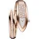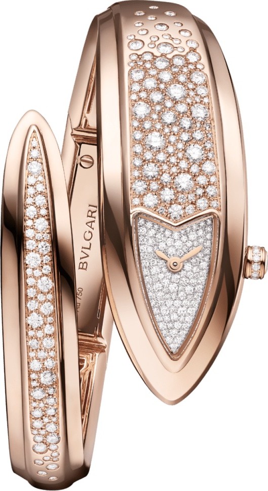 Đồng hồ Serpenti Aeterna với vỏ và dây đeo hình đầu rắn bằng vàng hồng 18kt, đính kim cương cắt brilliant, cùng mặt số kim cương pavé nguyên khối. Được chắt lọc tinh túy nhất, đồng hồ Serpenti Aeterna kết hợp sức mạnh biến hóa của loài rắn vào thiết kế vòng đeo tay điêu khắc tinh xảo, mang đến sự linh hoạt và dễ dàng kết hợp với những sáng tạo trang sức biểu tượng của Bvlgari. Được chế tác từ vàng hồng 18kt và đính kim cương cắt brilliant, chiếc đồng hồ tái hiện biểu tượng huyền thoại và biểu tượng vĩnh cửu của Maison, một tuyên ngôn táo bạo, đương đại về sự tiến hóa vô hạn. Mặt số pavé nguyên khối càng làm nổi bật vẻ đẹp rực rỡ của tác phẩm, trong khi dây đeo bên trong được chạm khắc tỉ mỉ họa tiết vảy rắn đặc trưng. Đồng hồ Serpenti Aeterna với bộ máy thạch anh, chức năng giờ và phút, vỏ hình đầu rắn cong bằng vàng hồng 18kt đính kim cương cắt brilliant, mặt số kim cương lát toàn bộ, kim mạ vàng hồng, núm vặn bằng vàng hồng 18kt đính kim cương và một viên kim cương cắt brilliant, vòng đeo tay bằng vàng hồng 18kt đính kim cương cắt brilliant. Đường kính (mm): 24. Hình dạng vỏ: Shape. Chức năng: Giờ-Phút. Kiểu máy: Thạch anh. Chất liệu dây đeo: Vàng hồng. Độ chống nước: 30 m. Chất liệu: Vàng hồng. Đá quý: Kim cương. Màu sắc: Hồng. Sản xuất tại: Thụy Sĩ. Màu dây đeo: Vàng