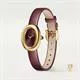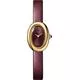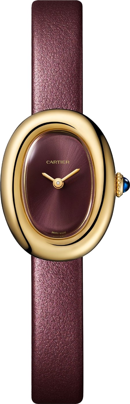 Thiết kế năm 1912 của chiếc đồng hồ sau này được đặt tên là "Baignoire" đã chứng minh được tài năng của Cartier trong việc chế tác hình dáng đồng hồ. Một hình elip thanh lịch được rèn độc đáo trên một đường thẳng duy nhất, chiếc đồng hồ "Baignoire" là tinh hoa của phong cách Cartier: sự kết hợp không gì sánh bằng giữa sự thuần khiết và vẻ đẹp vượt thời gian. Đồng hồ Baignoire de Cartier. Mẫu mini. Bộ máy thạch anh. Vỏ bằng vàng vàng 18K (750/1000) và núm điều chỉnh đính hạt đính đá sapphire cabochon. Mặt số sơn mài Prune. Kim hình thanh kiếm bằng thép hoàn thiện màu vàng. Mặt kính sapphire. Dây đeo bằng da bê hoàn thiện bằng satin Prune. Khóa ardillon bằng vàng vàng 18K (750/1000). Kích thước vỏ: 24,6 mm x 18,7 mm. Độ dày: 7,2 mm. Khả năng chống nước lên đến 3 bar (khoảng 30 mét/100 feet).