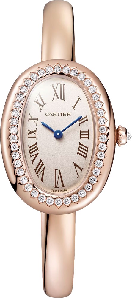 Thiết kế năm 1912 của chiếc đồng hồ sau này được đặt tên là "Baignoire" đã chứng minh được tài năng của Cartier trong việc chế tác hình dạng đồng hồ. Một hình elip thanh lịch được rèn độc đáo trên một đường thẳng duy nhất, chiếc đồng hồ "Baignoire" là tinh hoa của phong cách Cartier: sự kết hợp vô song giữa sự thuần khiết và sự sang trọng vượt thời gian. Đồng hồ Baignoire de Cartier. Mẫu nhỏ. Cỡ 17. Bộ máy thạch anh. Vỏ bằng vàng hồng 18K (750/1000) được đính 42 viên kim cương cắt sáng bóng với tổng trọng lượng 0,48 carat. Núm điều chỉnh bằng vàng hồng 18K (750/1000) đính một viên kim cương với tổng trọng lượng 0,08 carat. Mặt số màu bạc. Kim hình thanh kiếm bằng thép xanh. Mặt kính sapphire. Chiều dài: 31,4 mm. Chiều rộng: 23,1 mm. Độ dày: 6,9 mm. Khả năng chống nước lên đến 3 bar (khoảng 30 mét/100 feet).