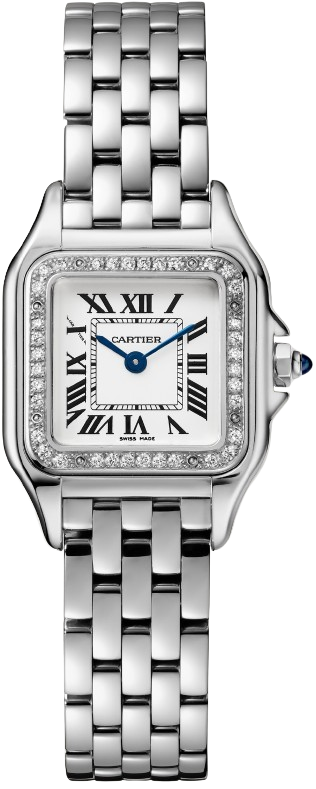 Được thiết kế vào những năm 1980, đồng hồ Panthère de Cartier lấy tên từ chiếc vòng đeo tay cùng tên. Cấu trúc siêu linh hoạt của nó mô phỏng chuyển động của loài động vật biểu tượng của Maison. Vừa là đồng hồ vừa là trang sức, đây thực sự là một biểu tượng thời trang dành cho những quý cô có phong cách táo bạo. Đồng hồ Panthère de Cartier. Mẫu nhỏ. Bộ máy thạch anh. Vỏ thép. Vành bezel đính kim cương cắt brilliant. Kích thước: 23 mm x 30 mm. Độ dày: 6 mm. Núm vặn đính đá spinel xanh tổng hợp. Mặt số mạ bạc. Kim đồng hồ hình thanh kiếm bằng thép xanh. Dây đeo thép. Độ chống nước ở độ sâu 3 bar (khoảng 30 mét).