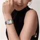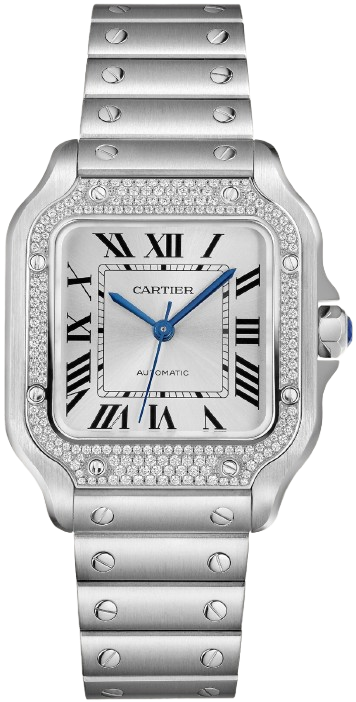 Năm 1904, Louis Cartier đã thực hiện được mong ước của phi công lừng danh người Brazil Alberto Santos Dumont: có thể xem giờ ngay cả khi đang bay. Sự ra đời của một trong những chiếc đồng hồ đeo tay đầu tiên đã gắn kết tình bạn giữa hai người tiên phong này. Các góc bo tròn của mặt số, đường cong liền mạch của sừng và các ốc vít lộ ra tạo nên một chiếc đồng hồ mang tính biểu tượng sẽ truyền cảm hứng cho vô số cách diễn giải lại. Đồng hồ Santos. Mẫu trung bình. Bộ máy cơ với dây cót tự động. Vỏ thép cỡ 1847 Mc.. Vành thép được đính 206 viên kim cương cắt sáng với tổng trọng lượng 0,64 carat. Núm vặn hình bảy cạnh được đính spinel tổng hợp nhiều mặt. Mặt số tia nắng. Kim hình thanh kiếm bằng thép xanh. Tinh thể sapphire. Dây đeo bằng thép với hệ thống điều chỉnh "SmartLink". Dây đeo thứ hai bằng da bê. Với khóa cài bằng thép có thể thay đổi được. Cả hai dây đeo đều được trang bị hệ thống thay đổi "QuickSwitch". Chiều rộng vỏ: 35,1 mm. Độ dày: 8,83 mm. Chống nước lên đến 10 bar (khoảng 100 mét/330 feet)