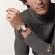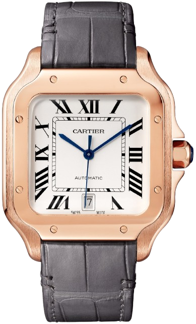 Năm 1904, Louis Cartier đã hiện thực hóa mong ước của phi công lừng danh người Brazil Alberto Santos Dumont: có thể xem giờ ngay cả khi đang bay. Sự ra đời của một trong những chiếc đồng hồ đeo tay đầu tiên đã gắn kết tình bạn giữa hai nhà tiên phong này. Các góc bo tròn của mặt số, đường cong liền mạch của sừng đồng hồ, và những chiếc ốc vít lộ ra đã tạo nên một chiếc đồng hồ biểu tượng, truyền cảm hứng cho vô số phiên bản cải tiến. Đồng hồ Santos. Mẫu lớn. Bộ máy cơ với bộ máy lên dây tự động cỡ nòng 1847 Mc. Vỏ vàng hồng 750/1000. Núm vặn 7 cạnh bằng vàng hồng 750/1000 đính đá sapphire cắt cạnh. Mặt số bạc Opaline. Kim hình thanh kiếm bằng thép xanh. Tinh thể sapphire. Một dây da cá sấu và một dây da bê với hệ thống thay thế "QuickSwitch". Khóa gập có thể thay thế bằng vàng hồng 750/1000. Chiều rộng vỏ: 39,8 mm. Độ dày: 9,38 mm. Khả năng chống nước ở độ sâu 10 bar (khoảng 100 mét)