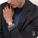 Năm 1904, Louis Cartier đã thực hiện được mong ước của phi công nổi tiếng người Brazil Alberto Santos Dumont: có thể xem giờ khi đang bay. Sự ra đời của một trong những chiếc đồng hồ đeo tay đầu tiên đã gắn kết tình bạn giữa hai người tiên phong này. Các góc bo tròn của mặt số, đường cong liền mạch của sừng và các ốc vít lộ ra đã tạo nên một chiếc đồng hồ mang tính biểu tượng, truyền cảm hứng cho vô số cách diễn giải lại. Đồng hồ Santos-Dumont, mẫu cực lớn, bộ máy cơ học của Manufacture lên dây cót thủ công, cỡ nòng 430 MC. Vỏ thép, vành vàng vàng 18K (750/1000), núm điều chỉnh bằng hạt thép đính đá spinel tổng hợp cabochon màu xanh lam, mặt số hoàn thiện bằng satin bạc với hiệu ứng tia nắng, số La Mã, kim hình thanh kiếm bằng thép xanh lam, tinh thể sapphire. Dây đeo bằng da cá sấu màu xám than chì, khóa ardillon bằng thép. Kích thước vỏ: 46,6 mm x 33,9 mm, độ dày: 7,5 mm. Chống nước ở độ sâu lên tới 3 bar (khoảng 30 mét/100 feet).