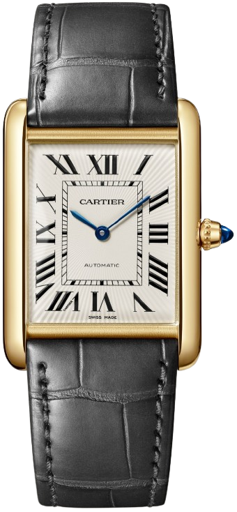 Được Louis Cartier thiết kế vào năm 1917, đồng hồ Tank là một biểu tượng của ngành chế tác đồng hồ hiện đại. Thiết kế thanh lịch của chiếc đồng hồ đeo tay này, kết hợp giữa hình học và tỷ lệ chính xác, đã định hình nên bản sắc mạnh mẽ của nó. Dễ dàng nhận biết và luôn bắt kịp thời đại, Tank đã được tái hiện trong hơn một thế kỷ với vô số biến thể vẫn trung thành với tinh thần của thiết kế ban đầu: Tank Cintrée, Tank Chinoise, Tank Américaine, Tank Française... Đồng hồ Tank Louis Cartier, mẫu lớn, máy cơ tự động lên dây, cỡ máy 1899 MC. Vỏ bằng vàng 18K (750/1000). Kích thước: 38,1 x 27,75 mm, độ dày: 8,18 mm. Mặt số mạ bạc dập nổi với lớp sơn mài vàng. Núm vặn bằng vàng 18K (750/1000) đính đá sapphire cabochon. Kim chỉ giờ và phút hình kiếm bằng thép xanh. Dây đeo bằng da cá sấu màu xám bán mờ. Chống nước ở độ sâu lên đến 3 bar (khoảng 30 mét/100 feet).