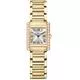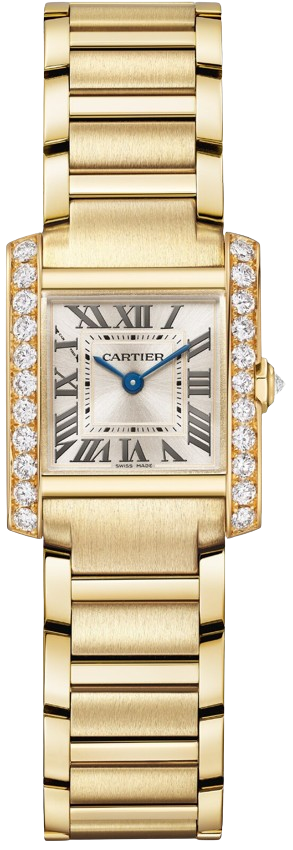 Được thiết kế bởi Louis Cartier vào năm 1917, đồng hồ Tank là biểu tượng của ngành chế tác đồng hồ hiện đại. Thiết kế tinh tế của chiếc đồng hồ đeo tay này, kết hợp hình học với tỷ lệ chính xác, tạo nên bản sắc táo bạo. Dễ dàng nhận ra và luôn đồng điệu với thời đại, Tank đã được tái hiện trong hơn một thế kỷ với vô số biến thể vẫn trung thành với tinh thần của thiết kế ban đầu: Tank Cintrée, Tank Chinoise, Tank Américaine, Tank Française... KÍCH THƯỚC 25,7 mm x 21,2 mm. Đồng hồ Tank Française. Mẫu nhỏ. Bộ máy thạch anh. Vỏ và núm điều chỉnh nhiều mặt bằng vàng vàng 18K (750/1000) được đính 23 viên kim cương cắt sáng bóng với tổng trọng lượng 0,78 carat. Mặt số tia nắng vàng. Kim hình thanh kiếm bằng thép xanh. Pha lê Sapphire. Dây đeo bằng vàng vàng 18K (750/1000). Kích thước vỏ: 25,7 mm x 21,2 mm. Độ dày: 6,8 mm. Chống nước lên đến 3 bar (khoảng 30 mét/100 feet)