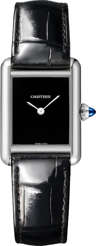Được Louis Cartier thiết kế vào năm 1917, đồng hồ Tank là một biểu tượng của ngành chế tác đồng hồ hiện đại. Thiết kế thanh lịch của chiếc đồng hồ đeo tay này, kết hợp giữa hình học và tỷ lệ chính xác, đã định hình nên bản sắc mạnh mẽ của nó. Dễ dàng nhận biết và luôn bắt kịp thời đại, Tank đã được tái hiện trong hơn một thế kỷ với vô số biến thể vẫn trung thành với tinh thần của thiết kế ban đầu: Tank Cintrée, Tank Chinoise, Tank Américaine, Tank Française... Đồng hồ Tank Must, mẫu nhỏ, máy quartz tự động cao. Vỏ thép, núm vặn đính đá spinel tổng hợp hình cabochon, mặt số sơn mài đen, kim chỉ giờ và phút hình kiếm mạ rhodium, dây đeo bằng da cá sấu đen bóng, khóa cài ardillon bằng thép. Kích thước vỏ: 29,5 x 22 mm, độ dày: 6,6 mm. Chống nước đến 3 bar (khoảng 30 mét/100 feet).