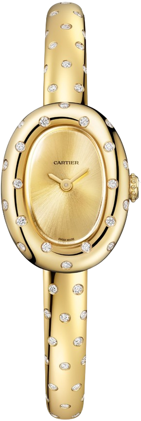 Thiết kế năm 1912 của chiếc đồng hồ sau này được đặt tên là “Baignoire” đã thể hiện tài năng bậc thầy của Cartier trong việc chế tác các hình dáng đồng hồ. Với hình elip thanh lịch được tạo nên độc đáo chỉ bằng một đường thẳng, đồng hồ “Baignoire” là tinh túy của phong cách Cartier: sự kết hợp hoàn hảo giữa sự tinh khiết và vẻ sang trọng vượt thời gian. Đồng hồ Baignoire, phiên bản mini, cỡ 15, máy quartz. Vỏ bằng vàng 18K (750/1000) nạm 29 viên kim cương cắt brilliant tổng cộng 0,29 carat. Núm vặn bằng vàng 18K (750/1000) nạm một viên kim cương cắt brilliant tổng cộng 0,07 carat. Dây đeo cứng bằng vàng 18K (750/1000), nạm 46 viên kim cương cắt brilliant tổng cộng 0,45 carat. Mặt số vàng, kim chỉ giờ và phút hình kiếm bằng thép mạ vàng, mặt kính sapphire. Chiều dài: 24,6 mm, chiều rộng: 18,7 mm, độ dày: 7,2 mm. Chống nước ở độ sâu lên đến 3 bar (khoảng 30 mét/100 feet).