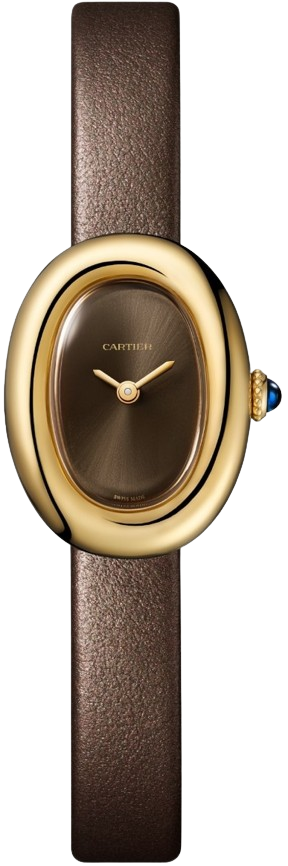 Thiết kế năm 1912 của chiếc đồng hồ sau này được đặt tên là “Baignoire” đã thể hiện tài năng bậc thầy của Cartier trong việc chế tác các hình dáng đồng hồ. Với hình elip thanh lịch được tạo nên độc đáo chỉ bằng một đường thẳng, đồng hồ “Baignoire” là tinh túy của phong cách Cartier: sự kết hợp hoàn hảo giữa sự tinh khiết và vẻ sang trọng vượt thời gian. Đồng hồ Baignoire de Cartier, phiên bản mini, máy quartz. Vỏ và núm vặn bằng vàng 18K (750/1000) đính đá sapphire cabochon. Mặt số sơn mài màu đồng, kim chỉ giờ và phút hình kiếm bằng thép mạ vàng, mặt kính sapphire. Dây đeo bằng da bê màu đồng mờ, khóa cài ardillon bằng vàng 18K (750/1000). Kích thước vỏ: 24,6 mm x 18,7 mm, độ dày: 7,2 mm. Chống nước đến 3 bar (khoảng 30 mét/100 feet).