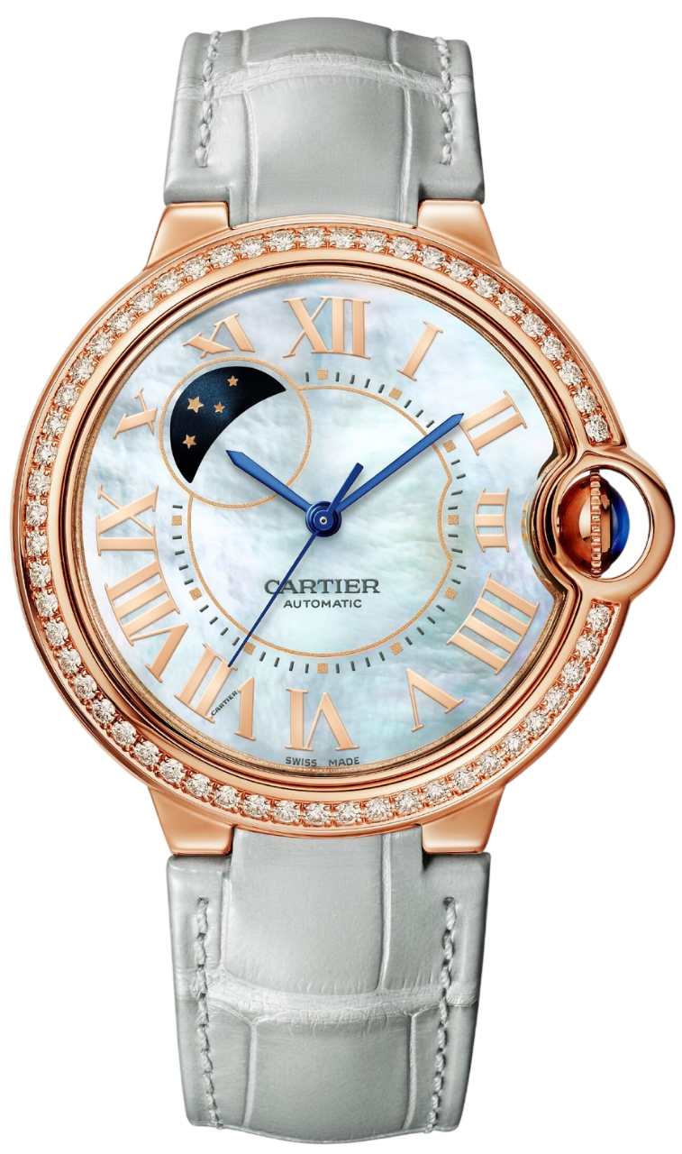 Với đồng hồ Ballon Bleu, Cartier mang đến một tầm nhìn độc đáo về sự tròn trịa, tất cả các đường cong và sự hài hòa. Một biểu tượng chế tác đồng hồ vượt thời gian, với những đường tròn thanh lịch ôm trọn làn da. Đồng hồ Ballon Bleu de Cartier, 36 mm. Bộ máy cơ tự động lên dây, hiển thị ngày/đêm. Vỏ bằng vàng hồng 18K (750/1000) nạm 54 viên kim cương cắt brilliant tổng cộng 0,79 carat. Núm vặn bằng vàng hồng 18K (750/1000) có khía, nạm đá sapphire cabochon. Mặt số khảm xà cừ với đĩa hiển thị ngày và đêm. Kim chỉ giờ và phút hình kiếm bằng thép xanh. Mặt kính sapphire. Dây đeo bằng da cá sấu màu xám xanh, khóa cài ardillon bằng vàng hồng 18K (750/1000). Độ dày vỏ: 12,11 mm. Chống nước đến 3 bar (khoảng 30 mét/100 feet).