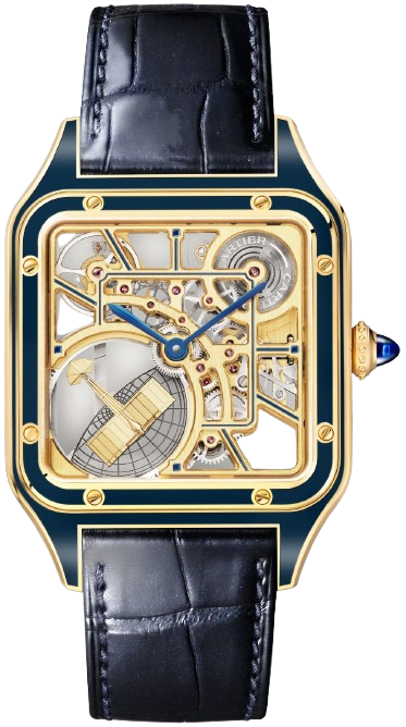Năm 1904, Louis Cartier đã hiện thực hóa ước nguyện của phi công nổi tiếng người Brazil, Alberto Santos Dumont: có thể xem giờ khi đang bay. Sự ra đời của một trong những chiếc đồng hồ đeo tay đầu tiên đã củng cố tình bạn giữa hai nhà tiên phong này. Các góc bo tròn của mặt số, đường cong liền mạch của càng đồng hồ và các vít lộ ra ngoài đã tạo nên một chiếc đồng hồ mang tính biểu tượng, truyền cảm hứng cho vô số phiên bản tái hiện. Đồng hồ Santos-Dumont micro-rotor skeleton, cỡ lớn, 31 mm, bộ máy cơ tự động, cỡ nòng 9629 MC. Vỏ bằng vàng 18K (750/1000) với lớp sơn mài xanh lam, kim chỉ giờ và phút hình kiếm bằng thép xanh lam được đánh bóng, mặt kính sapphire và nắp lưng bằng sapphire, các cầu nối được phủ sơn mài xanh lam. Dây đeo bằng da cá sấu xanh lam được đánh bóng, dây đeo thứ hai bằng da cá sấu xanh lam mờ, khóa ardillon bằng vàng 18K (750/1000). Kích thước bộ máy: 23,2 mm. Độ dày bộ máy: 4,4 mm. Dao động cân bằng: 28.800 dao động/giờ, dự trữ năng lượng khoảng 44 giờ. Kích thước vỏ: 31 mm. Độ dày: 8 mm. Phiên bản giới hạn 150 chiếc, mỗi chiếc được đánh số riêng. Chống nước đến 3 bar (khoảng 30 mét/100 feet).