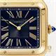 Năm 1904, Louis Cartier đã thực hiện được mong ước của phi công lừng danh người Brazil Alberto Santos Dumont: có thể xem giờ ngay cả khi đang bay. Sự ra đời của một trong những chiếc đồng hồ đeo tay đầu tiên đã gắn kết tình bạn giữa hai người tiên phong này. Các góc bo tròn của mặt số, đường cong liền mạch của sừng và các ốc vít lộ ra tạo nên một chiếc đồng hồ mang tính biểu tượng, truyền cảm hứng cho vô số cách diễn giải lại. Đồng hồ Santos-Dumont. Mẫu lớn. Bộ máy thạch anh. Vỏ vàng vàng 18K (750/1000). Núm vặn đính hạt với spinel xanh tổng hợp hình cabochon. Mặt số xanh lam chải satin với hiệu ứng tia nắng. Số La Mã vàng. Kim hình thanh kiếm bằng thép hoàn thiện vàng. Pha lê Sapphire. Dây đeo bằng da cá sấu xanh. Khóa ardillon bằng vàng vàng 18K (750/1000). Kích thước vỏ: 43,5 mm x 31,4 mm. Độ dày: 7,3 mm. Chống nước lên đến 3 bar (khoảng 30 mét/100 feet)