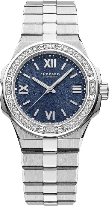 Đồng hồ Alpine Eagle thể thao, tinh tế và mạnh mẽ, bộ sưu tập đồng hồ mới mang phong cách thể thao, sang trọng là phiên bản tái hiện đương đại của St Moritz, chiếc đồng hồ đầu tiên được Karl-Friedrich Scheufele, hiện là Đồng chủ tịch của Maison Chopard, chế tác vào năm 1980. Được ông lên ý tưởng và đích thân thiết kế, Alpine Eagle được thúc đẩy bởi niềm đam mê dành cho dãy Alps và sức mạnh cao cả của loài đại bàng ngự trị nơi đây. Được chế tác từ kim loại độc quyền, siêu bền, phản chiếu ánh sáng có tên Lucent Steel™, đồng hồ chuyển động theo nhịp điệu của bộ máy được chứng nhận chronometer. Alpine Eagle dành riêng cho những chú đại bàng đương đại, những cá nhân đầy khát vọng, luôn vượt trội trong cuộc sống hàng ngày và có tầm nhìn truyền cảm hứng và nâng tầm. Với tầm nhìn xa và quyết tâm, họ hành động để đón đầu những thách thức của tương lai và nhận thức rõ tầm quan trọng của các vấn đề môi trường. Kim loại Thép không gỉ. Đường kính vỏ 33. Độ dày 7,95 mm. Với màu xanh Aletsch có được thông qua quá trình xử lý mạ điện - thiết kế hoàn thiện lấy cảm hứng từ mống mắt đại bàng - chữ số La Mã và cọc số mạ rhodium. Chống nước 50 mét. Mặt sau bằng kính sapphire trong suốt. Chất liệu núm vặn Thép không gỉ. Kiểu núm vặn vặn chặt. Dù ở thành phố hay trên núi, chiếc đồng hồ Alpine Eagle này có thể tin tưởng vào độ tin cậy của bộ máy tự lên dây cót có thể nhìn thấy qua mặt sau trong suốt. Chopard Calibre 09.01-C được chế tác bởi các nghệ nhân của Maison từ 159 linh kiện. Nó tuân theo các thông số kỹ thuật nghiêm ngặt, đảm bảo khả năng dự trữ năng lượng 42 giờ và độ tin cậy tuyệt vời. Với đường kính chỉ 8 ligne, đây là một trong những chiếc đồng hồ nhỏ nhất được Viện Kiểm định Đồng hồ Chronometer Chính thức của Thụy Sĩ cấp chứng nhận danh giá về độ chính xác, mang lại cho chiếc đồng hồ này sự khác biệt đặc biệt. Bộ máy CHOPARD 09.01-C. Loại lên dây cót: bộ máy cơ tự lên dây cót. Chức năng giờ, phút, giây. Dự trữ năng lượng khoảng 42 giờ. Chứng nhận: Đồng hồ bấm giờ được chứng nhận (COSC). Tần số 3,5 Hz (25.200 dao động mỗi giờ), cầu được trang trí bằng Côtes de Genève, tấm chính vân tròn. Độ dày bộ máy 3,65. Số lượng bộ phận chuyển động 149. Chân kính 27. Loại khóa: khóa gập. Chất liệu khóa: Thép không gỉ