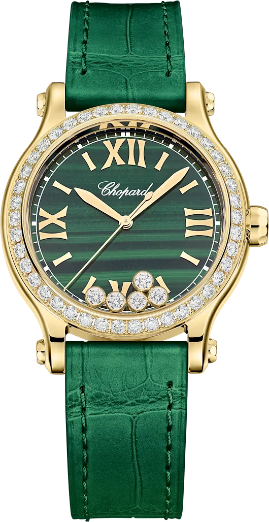 Bộ sưu tập Happy Sport là biểu tượng cho sự sáng tạo và táo bạo của Chopard. Những viên đá quý vui tươi, xoay tự do, nhảy múa giữa hai tinh thể sapphire, đã chiếm trọn trí tưởng tượng kể từ năm 1993, khi Chopard trở thành Maison đầu tiên kết hợp thép và kim cương. Chuyên môn chế tác đồng hồ của mình đã cho phép Chopard trang bị cho Happy Sport 33 mm một bộ máy cơ học có cơ chế lên dây tự động được phát triển đặc biệt cho các vỏ đồng hồ nữ. Những viên kim cương nhỏ làm nên những điều vĩ đại. Kim loại Vàng vàng 18K có đạo đức. Đường kính vỏ 33. Độ dày 11 mm. Kim cương trắng Carat 1,49. Khả năng chống nước 30 mét. Mặt sau bằng tinh thể sapphire trong suốt. Chất liệu núm điều chỉnh Vàng vàng 18K có đạo đức. Mặt kính trước Kính sapphire. Bộ máy CHOPARD 09.01-C. Loại lên dây cót: bộ máy cơ học lên dây tự động. Chức năng giờ, phút, giây. Dự trữ năng lượng khoảng 42 giờ. Tần số 3,5 Hz (25.200 dao động mỗi giờ). Trang trí trên các cầu chuyển động được trang trí bằng Côtes de Genève, tấm chính có vân tròn. Độ dày bộ máy 3.65. Số lượng bộ phận chuyển động 149. Chân kính 27. Kiểu khóa: khóa cài. Chất liệu khóa: vàng vàng 18K. Dây đeo: Dây da cá sấu màu xanh lá cây với đường khâu đồng bộ. Phiên bản giới hạn 25 chiếc.