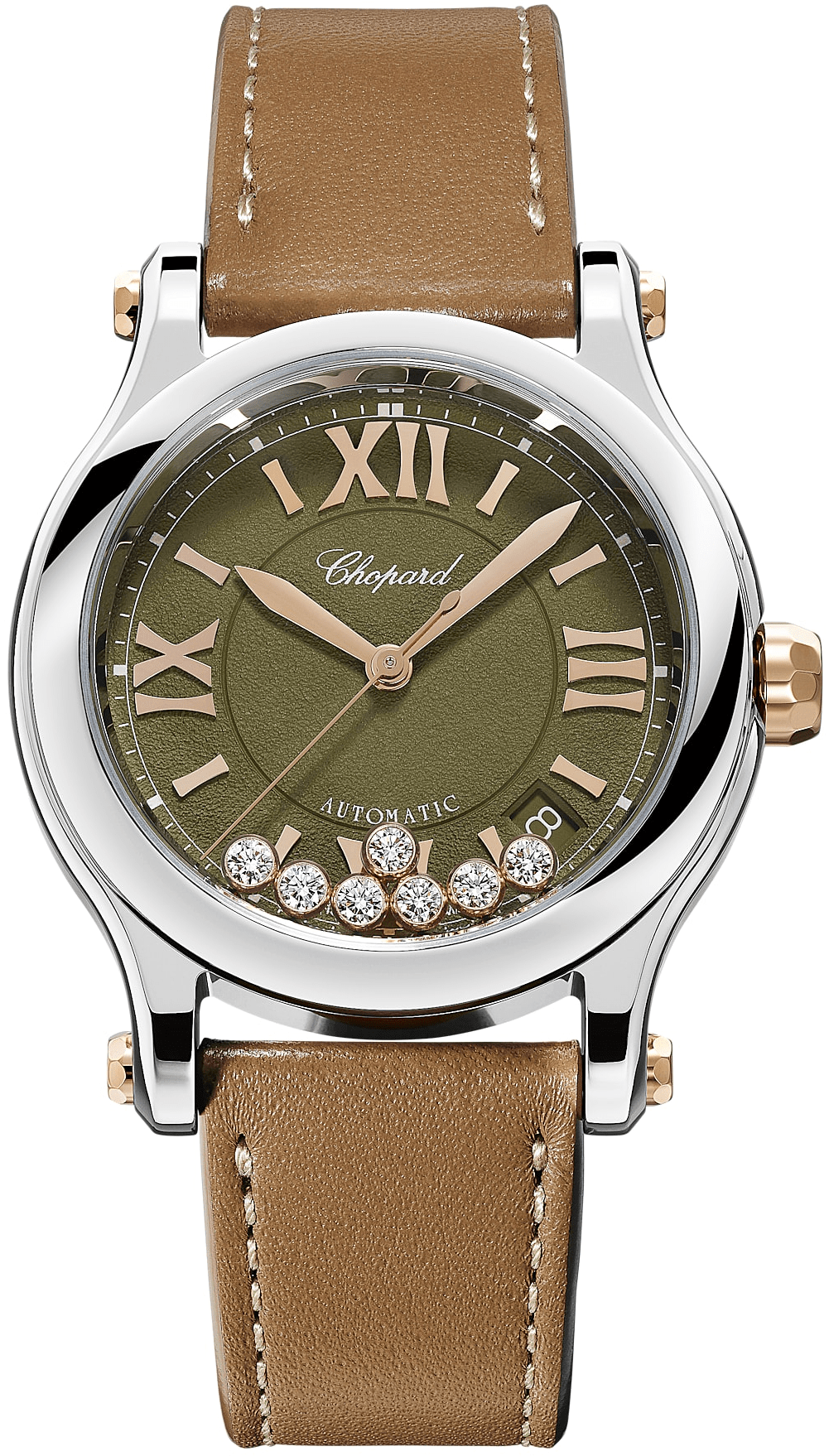 Với những đường cong mềm mại, Happy Sport là kiệt tác nghệ thuật chế tác đồng hồ đầy nữ tính, mang đến một sân khấu xa hoa cho những viên kim cương nhảy múa biểu tượng, được hình dung như tiếng vọng của làn sóng tự do đã thay đổi cuộc sống của phụ nữ trong thế kỷ 20. Là chiếc đồng hồ đầu tiên kết hợp vẻ đẹp quý phái của kim cương với sự chắc chắn của thép, đồng hồ kim cương Happy Sport sở hữu thiết kế độc đáo, trở thành biểu tượng ở ngã ba đường giữa đồng hồ và trang sức. Bộ sưu tập Happy Sport là biểu tượng cho sự sáng tạo và táo bạo của Chopard. Những viên đá quý vui tươi, xoay tự do, nhảy múa giữa hai tinh thể sapphire, đã chiếm trọn trí tưởng tượng kể từ năm 1993, khi Chopard trở thành Maison đầu tiên kết hợp thép và kim cương. Những viên kim cương nhỏ làm nên những điều vĩ đại. Kim loại: Vàng hồng 18K và thép không gỉ. Đường kính vỏ: 36. Độ dày: 12,15 mm. Kim cương trắng: 0,35 carat. Mặt số: Xanh kaki. Độ chống nước: 30 mét. Mặt sau: Tinh thể sapphire trong suốt. Chất liệu núm vặn: Vàng hồng 18K. Mặt kính: Kính sapphire. Loại lên dây: Bộ máy cơ tự lên dây. Chức năng: Ngày, giờ, phút, giây. Dự trữ năng lượng: Dự trữ năng lượng khoảng 62 giờ. Tần số: 4 Hz (28.800 dao động mỗi giờ). Độ dày bộ máy: 3,60. Chân kính: 21. Kiểu khóa: Khóa cài. Chất liệu khóa: Thép không gỉ. Dây đeo: Dây da bê màu nâu với đường khâu màu be