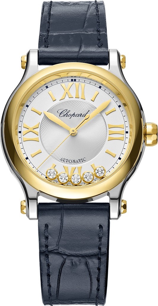 Bộ sưu tập Happy Sport là biểu tượng cho sự sáng tạo và táo bạo của Chopard. Những viên đá quý lấp lánh, xoay tự do, nhảy múa giữa hai lớp kính sapphire, đã thu hút trí tưởng tượng kể từ năm 1993, khi Chopard trở thành thương hiệu đầu tiên kết hợp thép và kim cương. Kinh nghiệm chế tác đồng hồ đã cho phép Chopard trang bị cho Happy Sport 33 mm bộ máy cơ khí với cơ chế lên dây tự động được phát triển đặc biệt dành cho đồng hồ nữ. Những viên kim cương nhỏ làm nên những điều tuyệt vời. Chất liệu: Vàng 18K và thép không gỉ. Đường kính vỏ: 33 mm. Độ dày: 10,84 mm. Kim cương trắng: 0,25 carat. Mặt số: Màu bạc với họa tiết guilloché ở trung tâm. Chống nước: 30 mét. Mặt sau: Kính sapphire trong suốt. Chất liệu núm vặn: Vàng 18K. Mặt kính: Kính sapphire. Nhờ kinh nghiệm chế tác đồng hồ, Chopard đã trang bị cho một số mẫu đồng hồ nữ của mình bộ máy cơ khí tự động 09.01-C, được phát triển và sản xuất nội bộ. Thành tựu kỹ thuật, sức quyến rũ, vẻ nữ tính tuyệt đỉnh: chiếc đồng hồ này hội tụ đầy đủ mọi yếu tố và không hề có sự thỏa hiệp. Bộ máy CHOPARD 09.01-C. Loại cơ chế lên dây: Cơ khí tự động. Chức năng: Giờ, phút và giây. Thời gian dự trữ năng lượng: Khoảng 42 giờ. Tần số: 3.5 Hz (25.200 dao động/giờ). Trang trí trên các cầu nối của bộ máy: Được trang trí bằng họa tiết Côtes de Genève, tấm đế chính được hoàn thiện bằng kỹ thuật mài tròn. Lò xo cân bằng: Dạng phẳng. Bánh xe cân bằng: Ba nan hoa. Độ dày bộ máy: 3.65. Số lượng chi tiết của bộ máy: 149. Số chân kính: 27. Loại khóa: Khóa ghim. Chất liệu khóa: Thép không gỉ. Dây đeo: Dây da cá sấu màu xanh lam với đường chỉ khâu cùng màu.