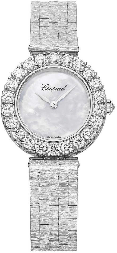 L'Heure du Diamant là bộ sưu tập hội tụ kho tàng kiến thức chuyên môn vô song và kỹ thuật chế tác trang sức kim cương điêu luyện: tinh hoa của nghệ thuật chế tác tinh xảo và vẻ đẹp hoàn mỹ. Với L'Heure du Diamant, Chopard đã khéo léo nắm bắt vẻ đẹp của kim cương. Là những bậc thầy được công nhận trong lĩnh vực đồng hồ trang sức xa xỉ, các nghệ nhân của Maison đã tạo nên sự giao thoa giữa thiết kế đương đại và nữ hoàng của đá quý. Kim loại: Vàng trắng 18K. Kim cương trắng: 2,23 carat. Độ chịu nước: 30 mét. Chất liệu núm vặn: Vàng trắng 18K. Chức năng giờ và phút. Chân kính: 18.