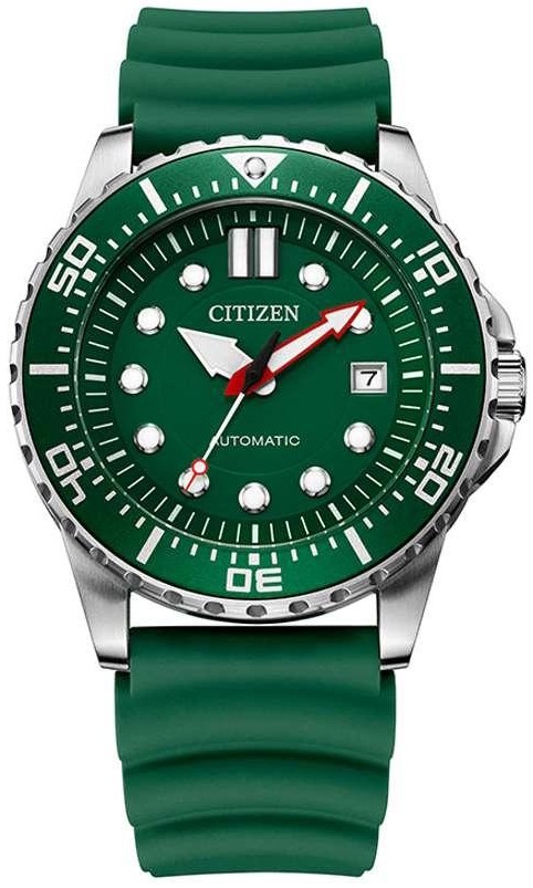 Màu xanh lá cây. Bộ máy cơ (tự động). Khả năng chống nước 100 m (10 ATM). Dây đeo hai mảnh. Màu vỏ bạc. Dành cho nam giới. Loại đồng hồ đeo tay. Màu dây đeo xanh lá cây. Chất liệu dây đeo cao su. Màu mặt số xanh lá cây. Mẫu Citizen Mechanical. Hình dạng đồng hồ tròn. Kích thước vỏ 43 mm. Chất liệu vỏ thép không gỉ.