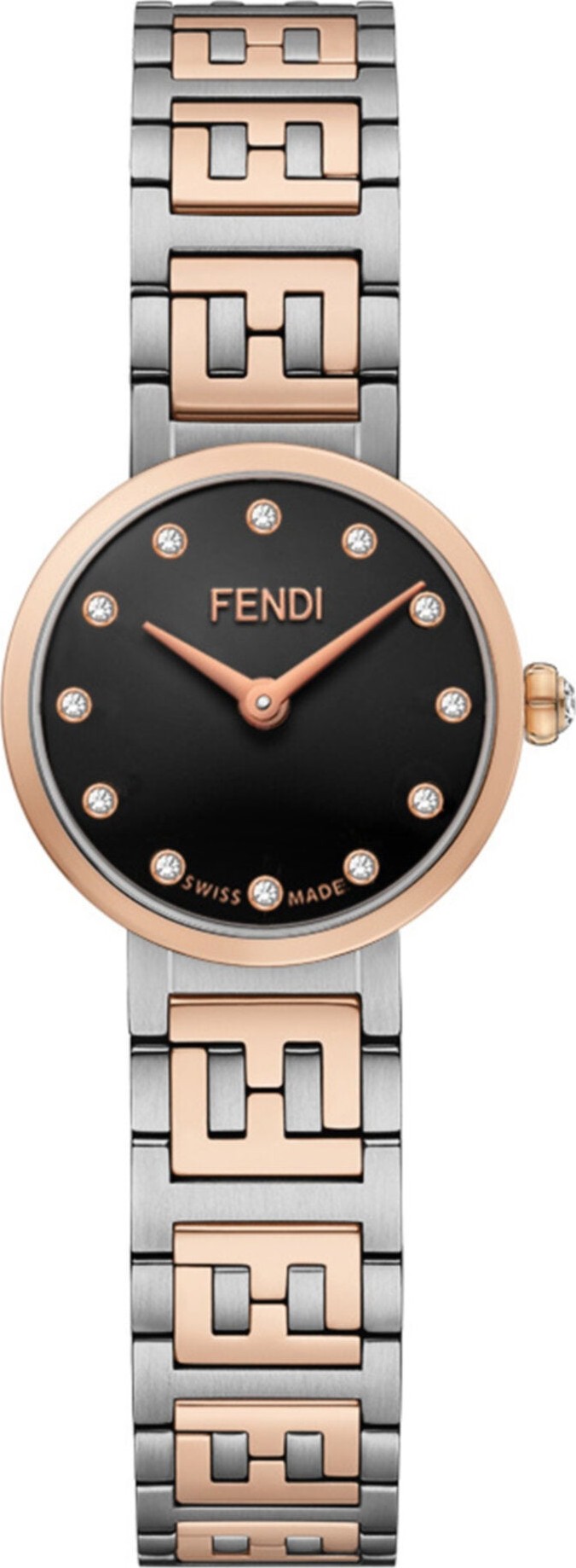 Vỏ đồng hồ 19 mm, bằng thép không gỉ được đánh bóng và chải xước, vành bezel và núm vặn bằng thép không gỉ mạ vàng hồng, núm vặn đính 1 viên kim cương (khoảng 0,02 carat). Mặt số màu đen opalin đính 12 viên kim cương làm vạch chỉ giờ (khoảng 0,03 carat), kim chỉ giờ màu vàng hồng. Dây đeo bằng thép không gỉ chải xước satin với các mắt xích trung tâm bằng thép không gỉ mạ vàng hồng đánh bóng có logo FF, khóa gập. Vỏ 19mm Vàng hồng/Thép không gỉ. Dây đeo hai tông màu. Mặt số đen opalin. Chống nước 3 ATM. Khóa gập. 13 viên kim cương, khoảng 0,05 carat. Bộ máy thạch anh sản xuất tại Thụy Sĩ.