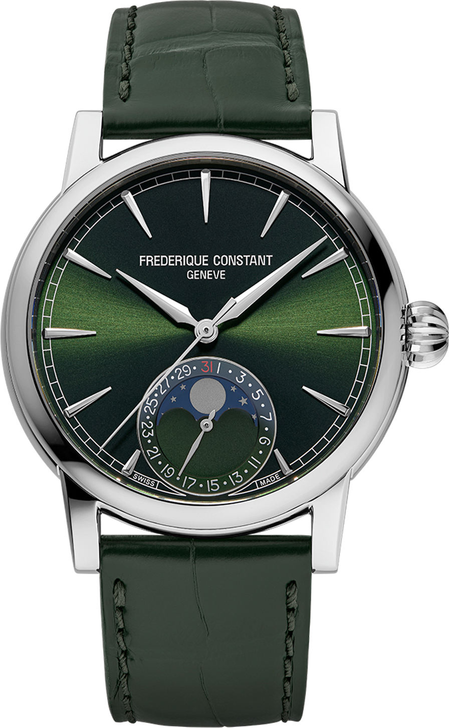 Bộ máy FC-716. Công nghệ bộ máy Tự động. Mô tả bộ máy. Được cung cấp năng lượng bởi việc nhả lò xo lên cót, bộ máy cơ học không bao giờ cần pin. Bộ máy cơ học tự động có trọng lượng dao động lên dây cót bằng chuyển động của cánh tay người đeo. Chức năng Giờ, Phút, Chu kỳ Mặt trăng, Ngày bằng tay. Màu vỏ: Tông màu bạc. Hình dạng vỏ: Tròn. Chất liệu vỏ: Thép không gỉ. Chiều dài vỏ: 40. Độ dày vỏ: 11,78. Chiều rộng càng (mm): 20. Khả năng chống nước: WR50/5Bar/166ft [Bơi trong nước tĩnh]. Màu mặt số: Xanh lá cây. Chất liệu mặt số: Đồng thau. Mặt kính: Mặt kính Sapphire chống phản quang. Mô tả về mặt kính: Chống va đập và vỡ - lớp phủ chống phản quang làm lệch hướng ánh sáng. Loại dây đeo: Dây đeo. Chất liệu dây đeo. Da cá sấu thật. Dây đeo: Xanh lá cây. Kiểu khóa: Khóa cài.