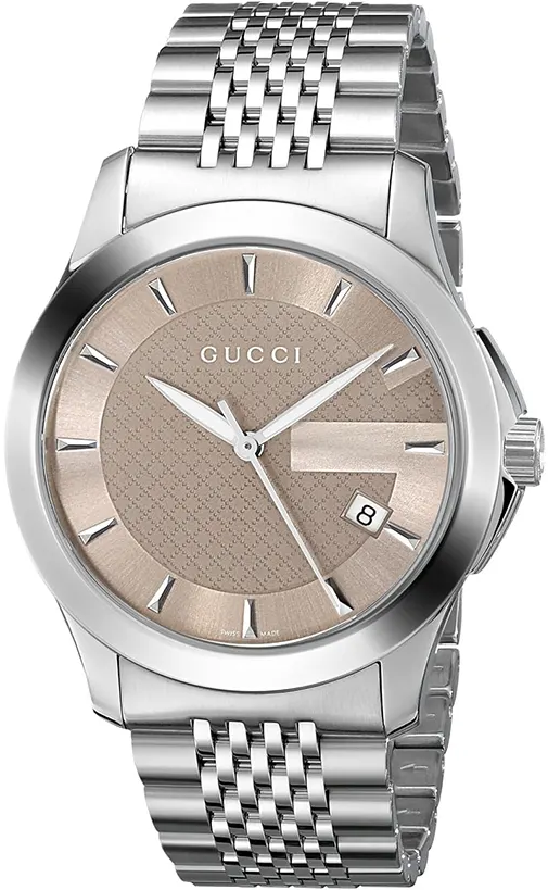 - Viền thép không gỉ cố định. Mặt số Gucci 'G' màu nâu với các kim màu bạc sáng và vạch chỉ giờ có hình que.