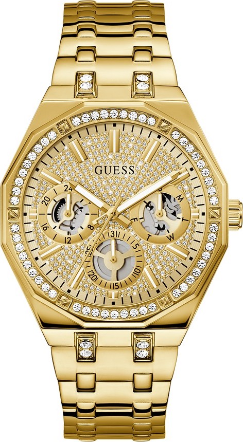 Nâng tầm phong cách lấp lánh của bạn với chiếc đồng hồ đa chức năng tông vàng tuyệt đẹp này! Chiếc đồng hồ thép tái chế tông vàng đánh bóng tròn 43 mm này được tô điểm bằng pha lê trên cả vỏ và dây đeo, kết hợp với mặt số đa chức năng lấp lánh có chi tiết cắt ở mặt số phụ. Với khả năng chống nước ở độ sâu 50 mét, chiếc đồng hồ nổi bật này hoàn hảo cho chàng trai GUESS, người đam mê lấp lánh tột độ. Đường kính vỏ 43 mm. Màu vỏ Tông vàng. Hình dạng vỏ Tròn. Chất liệu vỏ Thép tái chế. Hoàn thiện vỏ Đánh bóng. Chiều rộng dây đeo / Càng 24 mm. Dây đeo / Màu sắc Tông vàng. Chất liệu dây đeo Thép tái chế. Khóa dây đeo Khóa phi công. Chống nước ở độ sâu 50 mét. Đồng hồ thạch anh tương tự. Màu mặt số Sâm panh. Mặt kính pha lê Ống kính khoáng.