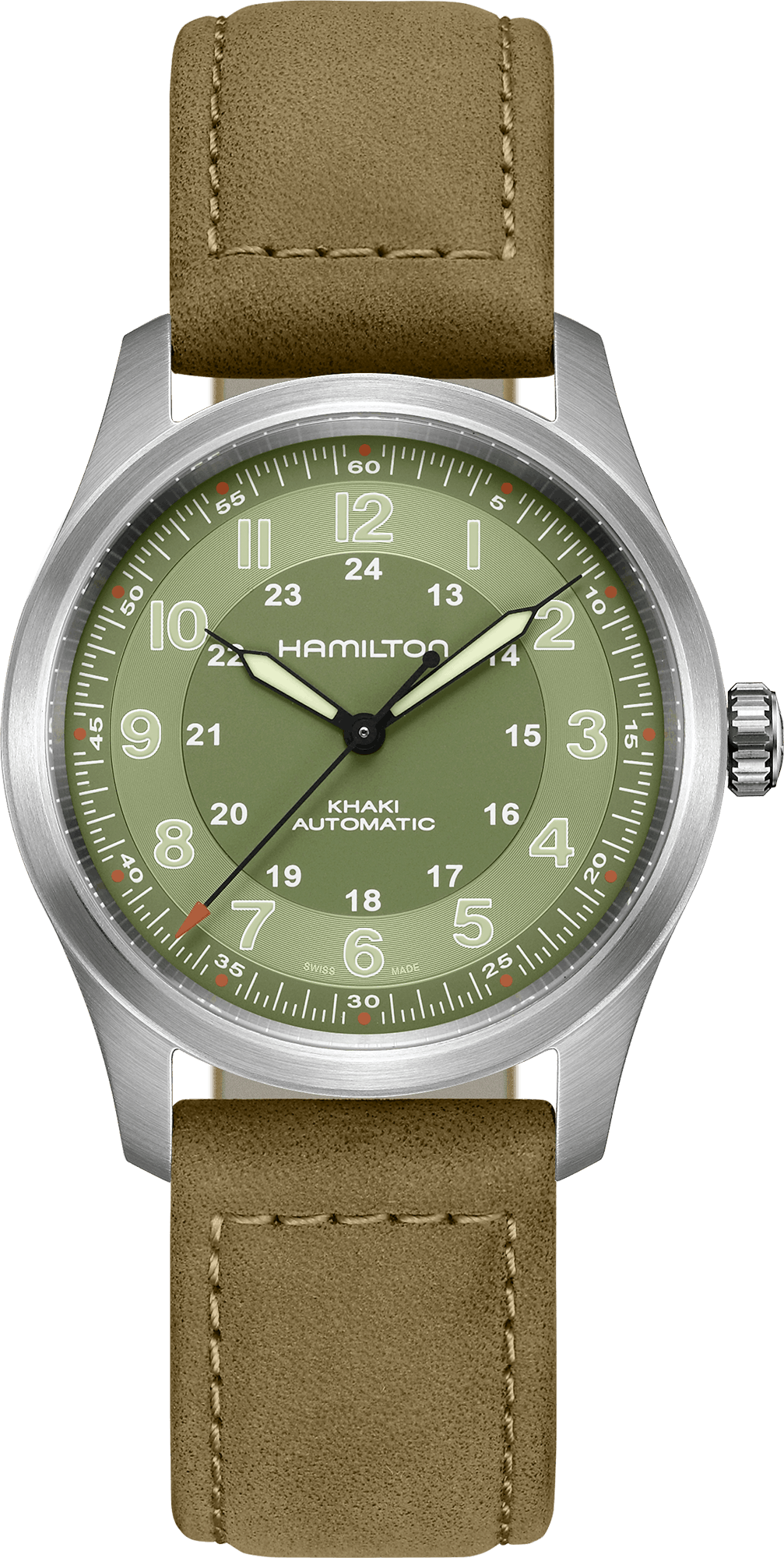 Sự kết hợp giữa bề dày lịch sử một thế kỷ trong lĩnh vực chế tác đồng hồ quân đội và chất liệu nhẹ đã tạo nên chiếc đồng hồ Khaki Field Titanium Automatic – chiếc đồng hồ đa năng hoàn hảo dành cho những người hùng hiện đại. Thực sự phù hợp với cuộc sống ngoài chiến trường, kích thước vỏ 38mm nhấn mạnh sự thoải mái và khả năng thích ứng với thiết kế mang đậm tính lịch sử. Bộ máy H-10. Bộ sưu tập Khaki Field. Máy tự động. Kích thước vỏ 38mm. Độ dày (mm) 11.45. Màu mặt số Xanh lá cây. Chất liệu vỏ Titan. Kính Sapphire. Chiều rộng càng đeo 20mm. Thời gian dự trữ năng lượng 80 giờ. Tình trạng Bộ sưu tập hiện tại. Khả năng chống nước 10 bar (100m)/145 psi (328ft). Mặt sau lộ máy Có. Nivachron Có. Super Luminova Có. Mã dây đeo H6000001211. Loại dây đeo Da bò. Loại khóa Khóa chữ H. Chiều rộng khóa 20mm.