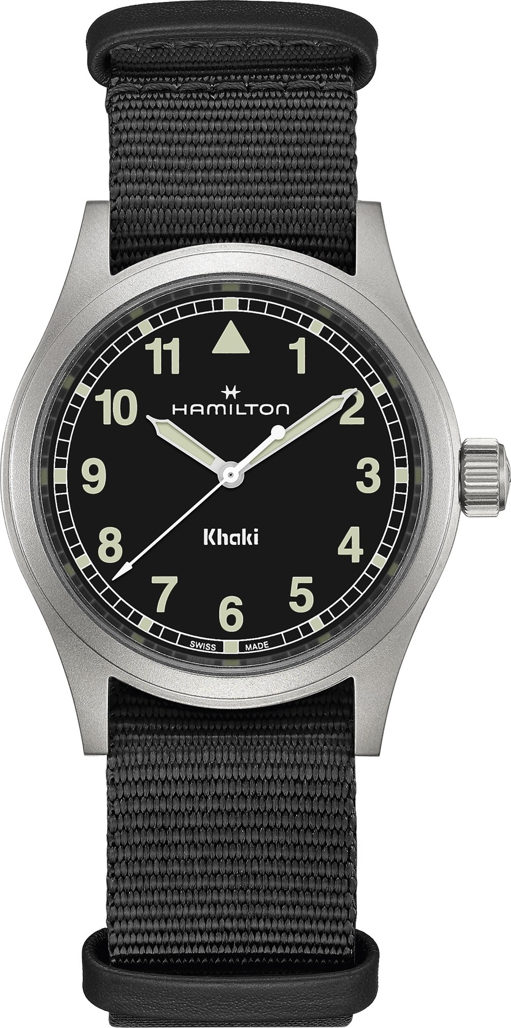 Đồng hồ Khaki Field Quartz thể hiện sự trở lại với di sản quân sự của Hamilton thông qua thiết kế đơn giản. Mặt số nổi bật với kiểu chữ rõ ràng, số Ả Rập thẳng hơn và vòng phút "đường ray". Bảng màu được thiết kế tinh tế, với mặt số đen bóng bẩy được tô điểm bởi các cọc số Super-LumiNova® màu xanh lá cây nhạt. Đồng hồ đi kèm dây đeo NATO bằng vải dệt màu đen và vòng da màu đen - hoàn hảo cho chuyến phiêu lưu tiếp theo của bạn trên chiến trường. Bộ máy F06.105. Bộ sưu tập Khaki Field. Bộ máy Quartz. Kích thước vỏ 38mm. Độ dày (mm) 8.3. Màu mặt số Đen. Chất liệu vỏ: Thép không gỉ. Tinh thể Sapphire. Chiều rộng càng 20mm. Độ chống nước: 5 bar (50m)/73 psi (164ft). Mã dây đeo: H6006821041. Kiểu dây: Vải dệt. Kiểu khóa: Khóa cài. Chiều rộng khóa 20mm.