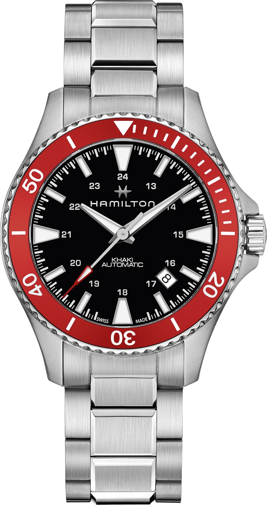Đồng hồ Khaki Navy Scuba Automatic 40mm có vành nhôm màu đỏ với lớp hoàn thiện phun cát, mang đến tông màu dịu nhẹ hơn, sâu hơn và độ bóng mờ. Lấy cảm hứng từ vũ trụ biển, màu đỏ tươi gợi nhớ đến đội cứu hộ đại dương đỏ rực và phía bên trái của thuyền buồm (bên mạn trái). Được trang bị bộ máy tự động H-10 của chúng tôi, chiếc đồng hồ này là sự lựa chọn hoàn hảo cho những ai đánh giá cao cả phong cách và hiệu suất. Hấp dẫn và phổ biến, phối màu đỏ tạo thêm nét độc đáo cho Khaki Navy Scuba, biến nó thành người bạn đồng hành vượt thời gian cho mọi thử thách, từ thám hiểm dưới nước đến phiêu lưu đô thị. Calibre H-10. Bộ sưu tập Khaki Navy. Bộ máy tự động. Kích thước vỏ 40mm. Độ dày (mm) 12,95. Màu mặt số Đen. Chất liệu vỏ Thép không gỉ. Pha lê Sapphire. Chiều rộng càng 20mm. Dự trữ năng lượng 80 giờ. Khả năng chống nước 10 bar (100m)/145 psi (328ft). Mã dây đeo H6056451001. Loại dây đeo: Thép không gỉ. Loại khóa: Khóa gấp. Chiều rộng khóa: 20mm