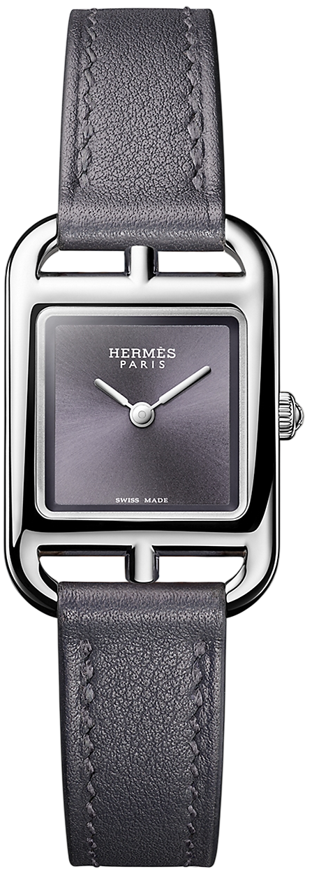 Mẫu mini, 27 mm. Chiều cao từ vấu này đến vấu kia: 27 mm. Chiều rộng vỏ: 21 mm. Vỏ thép. Mặt kính sapphire chống chói. Mặt số màu ardoise chải tia, viền màu ardoise đậm. Bộ máy quartz, sản xuất tại Thụy Sĩ. Chức năng hiển thị giờ, phút. Chống nước đến 3 bar. Tránh tiếp xúc với nước khi đeo đồng hồ da Hermès. Dây đeo đơn dài bằng da bê Swift màu ardoise, khóa ghim bằng thép.