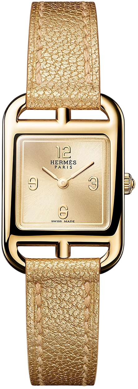 Mẫu mini, 27 mm. Chiều cao từ càng này đến càng kia: 27 mm. Chiều rộng vỏ: 21 mm. Vỏ vàng vàng. Mặt kính sapphire chống chói. Mặt số vàng ánh tia. Bộ máy thạch anh, sản xuất tại Thụy Sĩ. Chức năng hiển thị giờ, phút. Chống nước đến 3 bar. Tránh tiếp xúc với nước khi đeo đồng hồ da Hermès của bạn. Dây đeo đơn dài bằng da dê Chamkilight màu vàng, khóa ghim bằng vàng vàng.
