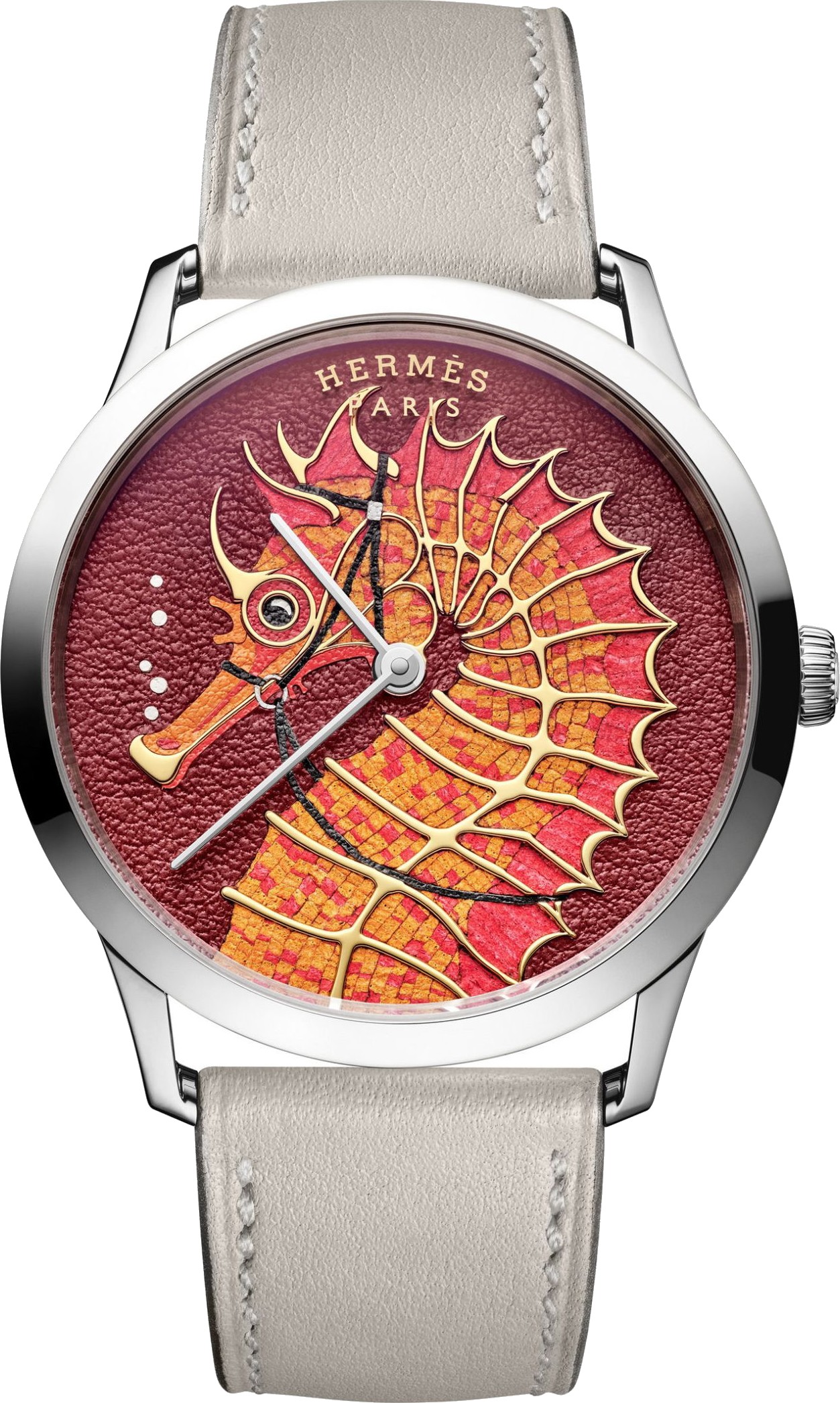 Chiếc đồng hồ Slim d’Hermès Hippocampe đánh dấu một chương mới trong câu chuyện nghệ thuật chế tác của thương hiệu, sử dụng kiểu dáng hiện đại tinh tế làm nền tảng cho kỹ nghệ chế tác đặc biệt. Phiên bản giới hạn này kết hợp khắc laser với khảm da để tạo nên hình ảnh một chú cá ngựa cách điệu, ý tưởng ban đầu của họa sĩ minh họa người London, Stuart Patience. Để chuyển hình ảnh chú cá ngựa lên mặt số, người thợ khắc bắt đầu bằng cách phác thảo đường viền và vẽ các đường cong bằng một loạt các công cụ chính xác. Sau đó, nghệ nhân khảm da chuẩn bị lớp da bê siêu mỏng, được cắt tỉa chỉ còn nửa milimét, trước khi cắt thành các mảnh nhỏ nhiều màu sắc. Mỗi mảnh được đặt bằng tay, khớp vào phần khắc nổi cho đến khi chú cá ngựa dần hiện ra với kết cấu và chiều sâu. Kết quả nằm trong vỏ vàng trắng 39,5 mm, chứa bộ máy tự động siêu mỏng H1950, có thể nhìn thấy qua mặt sau bằng sapphire, để lộ các chi tiết hoàn thiện tinh tế và họa tiết chữ H đặc trưng. Dây đeo bằng da bê Swift màu béton hoặc perle nhấn mạnh chuyên môn về da của Hermès, hoàn thiện hai phiên bản sống động được sản xuất với số lượng giới hạn chỉ 24 chiếc. Chất liệu vỏ: Vàng trắng. Kích thước vỏ: 39,5mm. Mặt sau vỏ: Hở. Màu mặt số: Mặt số nghệ thuật, Đỏ. Hoàn thiện mặt số: Khắc, Khảm. Chất liệu dây đeo: Da. Màu dây đeo: Xám. Loại khóa: Ghim. Bộ máy: Tự động. Caliber: H1950. Thời gian dự trữ năng lượng: 48 giờ. Khả năng chống nước: 3 ATM / 30 mét. Phiên bản giới hạn: Có. Chức năng: Giờ, Phút.