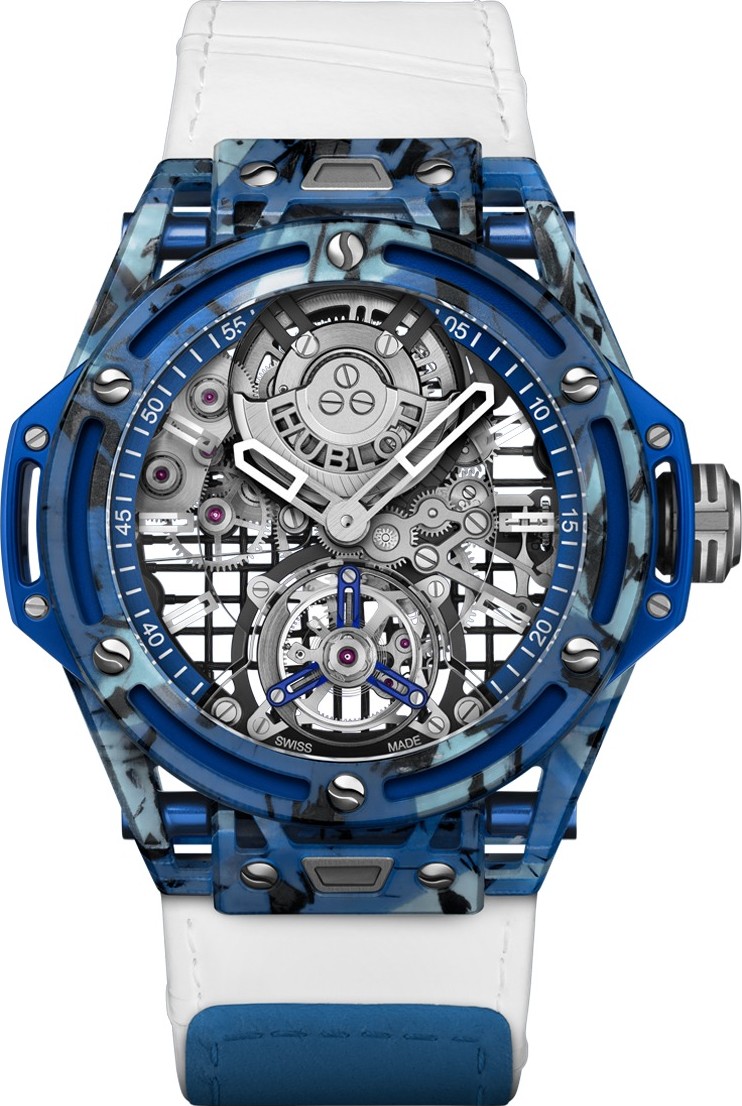 Có ba phiên bản của đồng hồ Hublot Big Bang Tourbillon Novak Djokovic GOAT Edition, mỗi phiên bản đều kết hợp sự đổi mới về vật liệu, kỹ thuật bậc thầy và phương pháp chế tác đồng hồ độc đáo của Hublot để kể câu chuyện về sự nghiệp quần vợt chuyên nghiệp vô song của Novak. Đồng hồ có ba màu sắc tương ứng với màu sắc quen thuộc của ba mặt sân quần vợt, và mỗi phiên bản được đánh số thứ tự để theo dõi số chiến thắng của Novak trên từng mặt sân. Theo đó, sẽ có 72 chiếc màu xanh lam, tượng trưng cho những chiến thắng trên sân cứng; 21 chiếc màu cam cho những chiến thắng trên sân đất nện; và, phiên bản độc quyền nhất, tám chiếc màu xanh lá cây cho những chiến thắng trên sân cỏ. 101 chiếc đồng hồ còn lại được đánh số nhưng không giới hạn số lượng. Nhân dịp bất kỳ chiến thắng nào trong tương lai, Hublot sẽ bổ sung thêm một chiếc đồng hồ nữa, với màu sắc tương ứng với mặt sân của giải đấu. Kích thước 44 mm. Vỏ: Vật liệu composite tái chế màu xanh mờ với họa tiết áo và vợt của N. Djokovic. Viền: Vật liệu composite tái chế màu xanh mờ với họa tiết áo và vợt của N. Djokovic. Khả năng chống nước: 30m hoặc 3 ATM. Mặt kính: Kính cường lực Gorilla Glass với lớp phủ chống phản chiếu. Mặt số: Mặt số bằng tinh thể sapphire. Bộ máy: Bộ máy tự động Tourbillon HUB6035 do hãng sản xuất. Thời gian dự trữ năng lượng: Khoảng 72 giờ. Dây đeo: Da bê màu trắng với họa tiết vân sọc, kèm khóa dán Velcro màu xanh dương. Dây đeo bổ sung: Dây đeo cao su màu trắng có đường vân. Khóa: Khóa thể thao bằng nhôm màu xanh bóng.