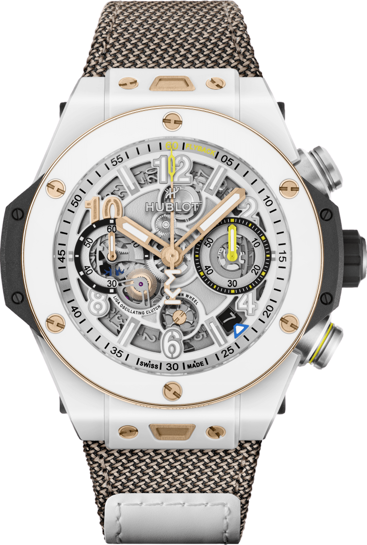 Kích thước 44 mm. Vỏ bằng gốm trắng được đánh bóng và phun cát siêu mịn. Vòng bezel bằng vàng 18K đánh bóng, khắc chữ «Trust Yourself»; vòng bezel trên bằng gốm trắng phun cát siêu mịn. Khả năng chống nước 100m hoặc 10 ATM. Mặt kính Sapphire với lớp phủ chống phản chiếu. Mặt số màu xám mờ mạ và mặt số lộ máy màu trắng. Bộ máy tự động HUB1280 UNICO sản xuất, chronograph lên dây cót. Bộ máy flyback với bánh xe cột. Thời gian dự trữ năng lượng khoảng 72 giờ. Dây đeo bằng vải màu vàng đồng với khóa dán Velcro. Dây đeo bổ sung: Dây đeo cao su có cấu trúc màu đen và trắng. Khóa cài bằng gốm trắng kiểu thể thao.