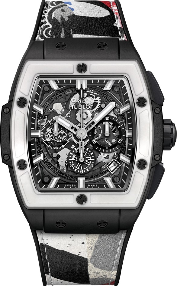 PHIÊN BẢN GIỚI HẠN CHỈ 50 CÁI TRÊN TOÀN THẾ GIỚI! Hublot hợp tác với nghệ sĩ đường phố Hush để tạo ra chiếc Spirit of Big Bang West Coast Ceramic đen và trắng này. Lấy cảm hứng từ các biểu tượng của Hollywood để đại diện cho "Danh tiếng" Bờ Tây và thể hiện dưới dạng bức chân dung của một người phụ nữ đen trắng rải rác khắp vỏ hộp trong một bức ảnh ghép nhiều màu của các phương tiện truyền thông hỗn hợp. Với logo Hush EWC17 ở giữa mặt số phụ ở vị trí 9 giờ.