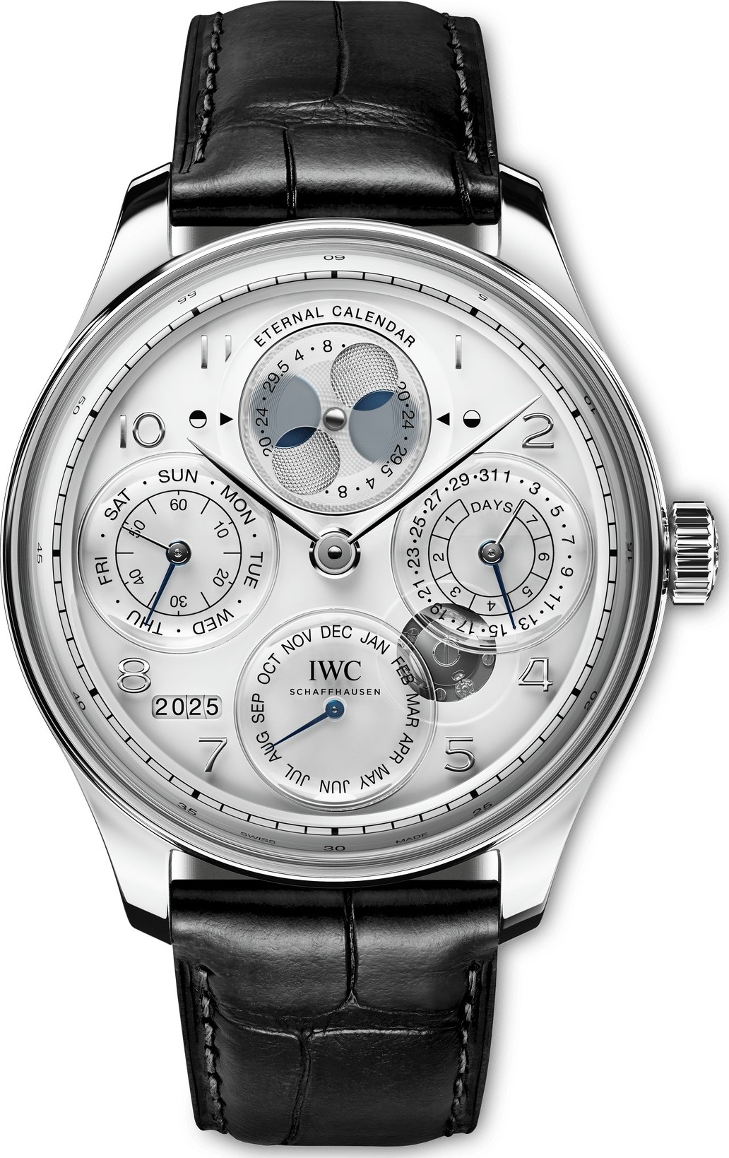 Portugieser Eternal Calendar là lịch vạn niên thế tục đầu tiên của IWC Schaffhausen và tự động xem xét các ngoại lệ năm nhuận của lịch Gregorian. Ngoài ra, tuyệt tác đồng hồ này còn có màn hình hiển thị pha mặt trăng với độ chính xác toán học là 45 triệu năm. Portugieser Eternal Calendar đã được trao giải thưởng “Grand Prix de l’Aiguille d’Or” tại Grand Prix d’Horlogerie de Genève lần thứ 24. Màu mặt số Trắng. Vỏ Bạch kim. Dây đeo Dây đeo bằng da cá sấu màu đen của Santoni. Bộ máy Tự động, lên dây cót, do IWC sản xuất. Kim giây nhỏ. Lên dây cót tự động Pellaton. Rotor có huy chương vàng 18 carat. Màn hình hiển thị dự trữ năng lượng Dự trữ năng lượng 7 ngày. Kính sapphire hộp đôi, lớp phủ chống phản quang ở cả hai mặt. Lịch vạn niên với màn hình hiển thị ngày, ngày, tháng, năm bằng bốn chữ số và pha mặt trăng vĩnh cửu. Chiều rộng dây đeo 22 mm. Chiều rộng khóa 18 mm. Vỏ bạch kim. Đường kính 44,4 mm. Chiều cao 14,9 mm. Khả năng chống nước 5 Bar. Vỏ sau với tinh thể sapphire tổng hợp. Calibre 52640. Loại chuyển động Tự động, tự lên dây cót. Chuyển động do IWC sản xuất Có. Dự trữ năng lượng 168 giờ. Tần số 28800 Vph (4 Hz). Linh kiện 396. Chân kính 54