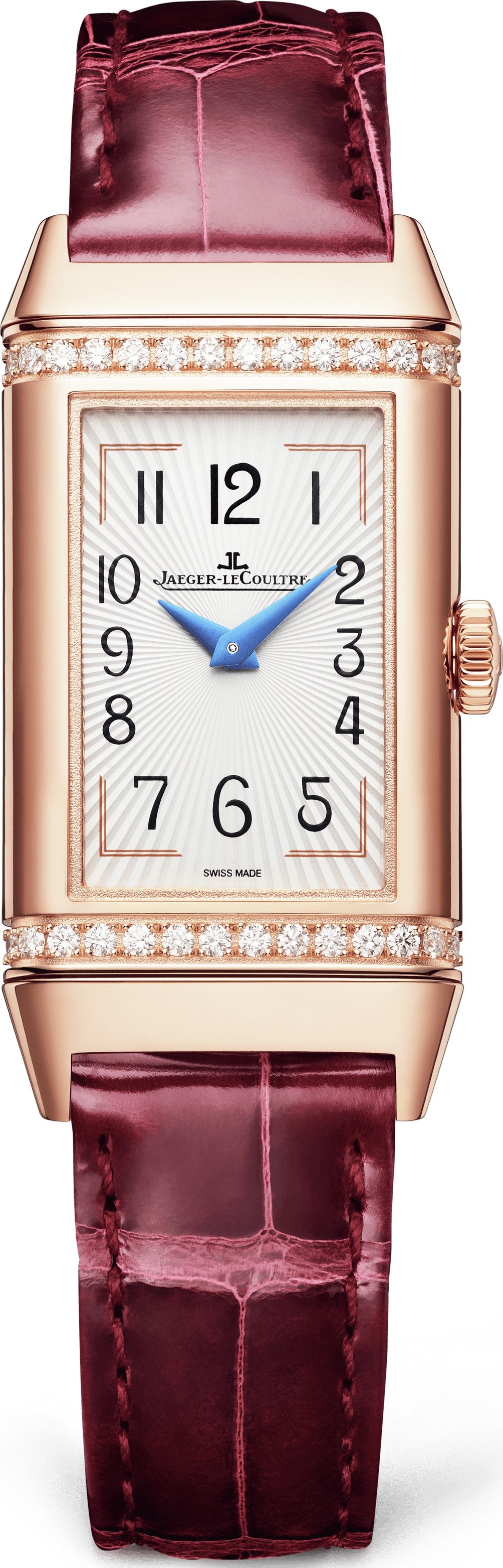 Chiếc Reverso One Duetto tái hiện lại những đặc điểm của các mẫu Reverso nữ đầu tiên, biểu tượng của phong cách Art Deco: vỏ hình chữ nhật thuôn dài, mặt số với tính thẩm mỹ tương phản, bộ kim kép quay ngược chiều nhau nhưng cùng chỉ một thời gian, các đường gờ được trang trí bằng hai hàng kim cương cắt giác rực rỡ, dây đeo bằng da cá sấu... Ở mặt sau của đồng hồ, mặt số màu đỏ tía được phủ lớp sơn mài lấp lánh làm nổi bật các vạch chỉ giờ thuôn dài, tỏa sáng như những tia nắng mặt trời. Phù hợp cho mọi dịp, mẫu đồng hồ này kết hợp phong cách độc đáo với vẻ nữ tính tinh tế. Vỏ vàng hồng 750/1000 (18 carat). Kích thước (Dài x Rộng): 40,1 x 20 mm, L: Khoảng cách giữa hai càng. Độ dày: 9,09 mm. Khả năng chống nước 3 bar. Mặt trước màu xám bạc, họa tiết guilloché tia nắng. Mặt sau chữ số Ả Rập, màu đỏ tía, họa tiết lấp lánh. Kim trước kiểu Dauphines. Kim sau kiểu Dauphines. Bộ máy Jaeger-LeCoultre Calibre 844. LOẠI MÁY: Lên dây cót thủ công. Chức năng: Giờ - Phút, giống nhau ở mặt trước/mặt sau. Độ dày: 3,45mm. Tần số dao động: 21600. Tần số (HZ): 3. Thời gian dự trữ năng lượng: 50 giờ. Số linh kiện: 100. Số chân kính: 17. Số hộp cót: 1. Dây đeo: Có thể thay thế: Được chế tác với công nghệ tháo lắp nhanh giúp thay đổi dây đeo dễ dàng. Chiều dài dây tiêu chuẩn ở vị trí 12 giờ: 65mm. Chiều dài ở vị trí 6 giờ: 105mm. Chiều rộng càng dây: 14mm. Khóa cài: Khóa ghim. Vàng hồng 750/1000 (18 carat). Chiều rộng khóa cài: 12mm.