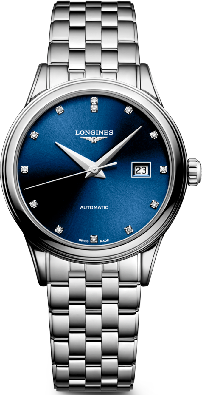 Bộ sưu tập Flagship là sự kết hợp hoàn hảo giữa truyền thống và hiện đại. Là dòng sản phẩm biểu tượng của thương hiệu kể từ cuối những năm 1950, Flagship là một trong những bộ sưu tập đầu tiên của Longines. Với sự cân bằng hài hòa giữa thiết kế cổ điển và sự thanh lịch, những chiếc đồng hồ Flagship tượng trưng cho khát vọng không ngừng nghỉ của Longines trong việc tìm kiếm sự hoàn hảo trong thế giới chế tác đồng hồ. Hình dạng vỏ: Tròn. Chất liệu: Thép không gỉ. Mặt kính: Kính sapphire chống trầy xước, với nhiều lớp phủ chống phản chiếu ở mặt dưới. Mặt sau vỏ: Mặt sau trong suốt với kính sapphire. Kích thước: 30.00 mm. Khoảng cách giữa các càng: 15 mm. Khoảng cách giữa hai càng: 36.40 mm. Độ dày: 8.10 mm. Khả năng chống nước: Chống nước đến 3 bar. Trọng lượng: 71.3 g. Màu mặt số: Xanh lam tia nắng. Vạch chỉ giờ: Kim cương. Kim: Kim mạ bạc được đánh bóng. Kim cương: Mặt số được đính 13 viên kim cương Top Wesselton VS-SI, tổng cộng 0.034 carat. Loại máy: Tự động. Chức năng: Giờ, phút, giây và ngày; Caliber: L592; Mô tả máy: Máy cơ tự động lên dây cót, hoạt động ở tần số 28.800 dao động mỗi giờ, với lò xo cân bằng silicon đơn tinh thể dự trữ năng lượng lên đến 45 giờ. Chất liệu dây đeo: Thép không gỉ. Khóa: Khóa gập ba chốt an toàn và cơ chế mở bằng nút bấm.