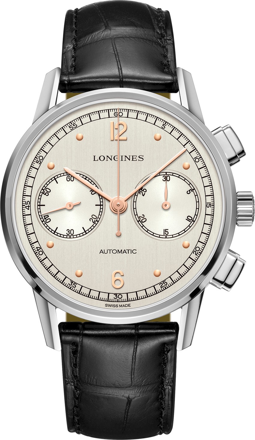 Vỏ thép không gỉ được đánh bóng. Mặt số màu bạc. Chữ số Ả Rập và vạch chỉ giờ có tông màu vàng hồng. Kim màu hồng được đánh bóng. Chức năng bấm giờ: Kim giây trung tâm lớn. Bộ đếm 30 phút ở vị trí 3 giờ. Bộ đếm giây nhỏ nằm ở vị trí 3 giờ. Vị trí 9 giờ.Logines Calibre L705, dao động ở tần số 28.800 vph và có khả năng dự trữ năng lượng trong 48 giờ.