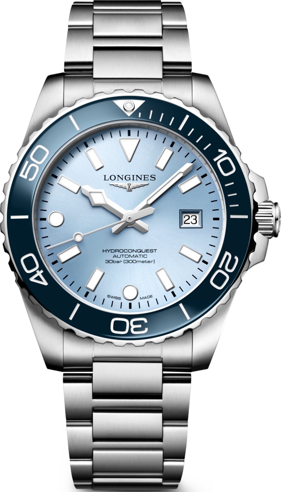 Bộ sưu tập HYDROCONQUEST kết hợp tính thẩm mỹ hiện đại với hiệu năng đã được chứng minh. Được trang bị bộ máy tự động độc quyền của LONGINES, khả năng chống nước lên đến 30 bar (300 m), với vòng bezel xoay một chiều, núm vặn và nắp lưng vặn chặt. Hình dạng vỏ: Tròn. Chất liệu: Thép không gỉ và vành bezel bằng gốm. Mặt kính: Kính sapphire chống trầy xước, với nhiều lớp phủ chống phản chiếu ở cả hai mặt. Nắp lưng: Nắp lưng vặn vít. Kích thước: 42,00 mm. Khoảng cách giữa các càng: 21 mm. Khoảng cách giữa hai càng: 51,20 mm. Độ dày: 11,70 mm. Khả năng chống nước: Chống nước đến 30 bar. Đặc điểm vỏ: Núm vặn, vành bezel xoay một chiều. Trọng lượng: 180,0 g. Màu mặt số: Xanh lam mờ, hiệu ứng tia nắng. Vạch chỉ giờ: Vạch chỉ giờ nổi. Kim: Kim mạ bạc và được đánh bóng. Đặc điểm: Phát quang Super-LumiNova® Thụy Sĩ. Loại máy: Tự động. Chức năng: Giờ, phút, giây và ngày. Bộ máy: L888. Mô tả máy: Máy cơ tự động lên dây cót, hoạt động ở tần số 25.200 dao động mỗi giờ, với lò xo cân bằng silicon đơn tinh thể dự trữ năng lượng lên đến 72 giờ. Chất liệu dây đeo: Thép không gỉ. Khóa: Khóa gập đôi an toàn với hệ thống điều chỉnh vi mô. Chống từ tính: Có