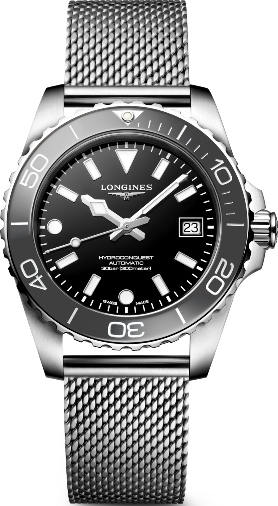 Bộ sưu tập HYDROCONQUEST kết hợp tính thẩm mỹ hiện đại với hiệu năng đã được chứng minh. Được trang bị bộ máy tự động độc quyền của LONGINES, chống nước đến 30 bar (300 m), với vành bezel xoay một chiều, núm vặn và nắp lưng vặn. Hình dạng vỏ: Tròn. Chất liệu: Thép không gỉ và vành bezel bằng gốm. Mặt kính: Kính sapphire chống trầy xước, với nhiều lớp phủ chống phản chiếu ở cả hai mặt. Nắp lưng: Nắp lưng vặn. Kích thước: 39,00 mm. Khoảng cách giữa các càng: 20 mm. Khoảng cách giữa hai càng: 48,10 mm. Độ dày: 11,70 mm. Khả năng chống nước: Chống nước đến 30 bar. Đặc điểm vỏ: Núm vặn, vành bezel xoay một chiều. Trọng lượng: 155,0 g. Màu mặt số: Đen sơn mài bóng. Vạch chỉ giờ: Vạch chỉ giờ nổi. Kim: Kim mạ bạc bóng. Đặc điểm: Phát quang Super-LumiNova® Thụy Sĩ. Loại máy: Tự động. Chức năng: Giờ, phút, giây và ngày. Bộ máy L888. Mô tả máy: Bộ máy cơ tự động lên dây cót với tần số 25.200 vòng/phút. rung động mỗi giờ, với lò xo cân bằng silicon đơn tinh thể dự trữ năng lượng lên đến 72 giờ. Chất liệu dây đeo: Thép không gỉ. Khóa: Khóa gập đôi an toàn với hệ thống điều chỉnh vi mô. Chống từ tính: Có