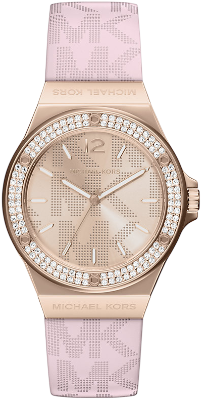 Chất liệu silicon. Phụ kiện mạ vàng hồng. Vòng bezel đính đá. Kích thước trung bình. Đường kính vỏ 37mm. Máy quartz/3 kim. Khóa cài. Chống nước đến 5 ATM.