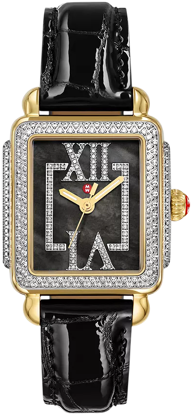 Chiếc đồng hồ Deco Madison Mid Pavé Roman kết hợp thiết kế vượt thời gian với những chi tiết hiện đại. Vỏ hình chữ nhật 31mm, được chế tác từ thép không gỉ mạ vàng hai tông màu 18K, được bao quanh bởi 231 viên kim cương được đính thủ công với tổng trọng lượng 0,76 carat. Mặt số khảm xà cừ đen với kim cương và các chữ số La Mã được đính kết tinh tế, kết hợp với dây đeo bằng da dập vân cá sấu màu đen bóng và có thể thay thế bằng bất kỳ vòng đeo tay MICHELE 16mm nào. Được hoàn thiện với mặt kính sapphire và trang bị bộ máy thạch anh Thụy Sĩ, chiếc đồng hồ này vừa thanh lịch vừa tiện dụng. Tổng số kim cương: 231. Tổng trọng lượng kim cương: 0.7600 carat. Kích thước vỏ: 31mm. Chiều rộng dây đeo: 16mm. Bộ máy: Thạch anh ba kim. Loại kính: Sapphire. Màu vỏ: Mạ vàng 18K hai tông màu. Chất liệu vỏ: Thép không gỉ. Màu dây đeo: Đen. Màu mặt số: Đen. Chất liệu dây đeo: Da. Kiểu dáng: Deco Madison Mid. Khả năng chống nước: 5 ATM. Khóa: Khóa cài đơn. Chu vi bên trong dây đeo: 175 +/- 5mm. Loại pin: 362/Oxit bạc.