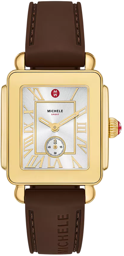 Mẫu đồng hồ Deco Sport Mid kết hợp màu nâu với thiết kế tinh tế. Vỏ thép không gỉ hình chữ nhật 31mm bao quanh mặt số trắng chải tia, được nhấn nhá bằng các vạch chỉ giờ La Mã bóng loáng và kim giây phụ. Dây đeo silicon màu nâu có thể thay thế bằng bất kỳ dây đeo 16mm nào từ bộ sưu tập của MICHELE, tăng thêm tính linh hoạt cho thiết kế. Kích thước vỏ: 31MM. Chiều rộng dây đeo: 16MM. Bộ máy: Thạch anh ba kim. Loại kính: K1. Màu vỏ: Vàng. Chất liệu vỏ: Thép không gỉ. Màu dây đeo: Nâu. Màu mặt số: Trắng. Chất liệu dây đeo: Silicon. Dòng sản phẩm: Deco Mid Sport. Khả năng chống nước: 5 ATM. Khóa: Khóa cài đơn. Chu vi bên trong dây đeo: 190+/- 5MM. Loại pin: SR621SW/Silver Oxide
