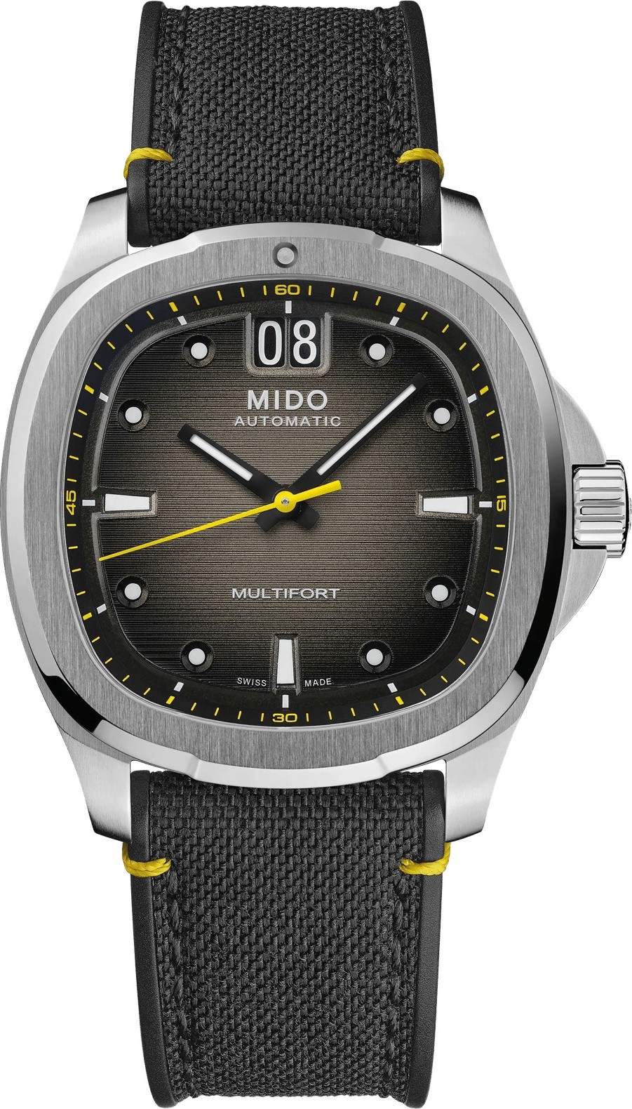 Một hồi tưởng tuyệt vời! Ra đời từ di sản phi thường của MIDO, vỏ máy hình TV trở lại vị trí trung tâm của Multifort TV Big Date, vừa mạnh mẽ vừa chính xác, nhờ bộ máy cơ học đáng gờm. Thiết kế hiện đại và năng động của chiếc đồng hồ Thụy Sĩ này được tô điểm bởi mặt số ấn tượng và chức năng đặc trưng: BIG DATE ở vị trí 12 giờ. Bộ máy tự động thế hệ mới nhất, Caliber 80, được trang bị lò xo cân bằng công nghệ cao Nivachron™, mang lại khả năng chống sốc và từ trường vượt trội. Bộ sưu tập Multifort. Khả năng chống nước 10 bar (100 m / 330 ft) với núm vặn vít. Trọng lượng (g) 94. Hình dạng vỏ Hình chữ nhật. Chất liệu vỏ Thép không gỉ. Pha lê Tinh thể sapphire được xử lý chống phản chiếu hai mặt. Tùy chọn vỏ Nắp lưng trong suốt, Núm vặn vặn chặt. Chiều dài vỏ (mm) 39,20. Chiều rộng (mm) 40,00. Độ dày trung bình (mm) 11,5. Chiều rộng vấu (mm) 22,00. Màu mặt số Xám chuyển sắc. Bộ máy MIDO Tự động ETA. Chức năng Ngày lớn. Dự trữ năng lượng Dự trữ năng lượng lên đến 80 giờ. Tham chiếu dây đeo/xích M603019599. Mặt trước dây đeo bằng vải. Mặt sau dây đeo bằng chất liệu tổng hợp. Chi tiết dây đeo bằng vải. Màu dây đeo Đen. Khóa Khóa cài